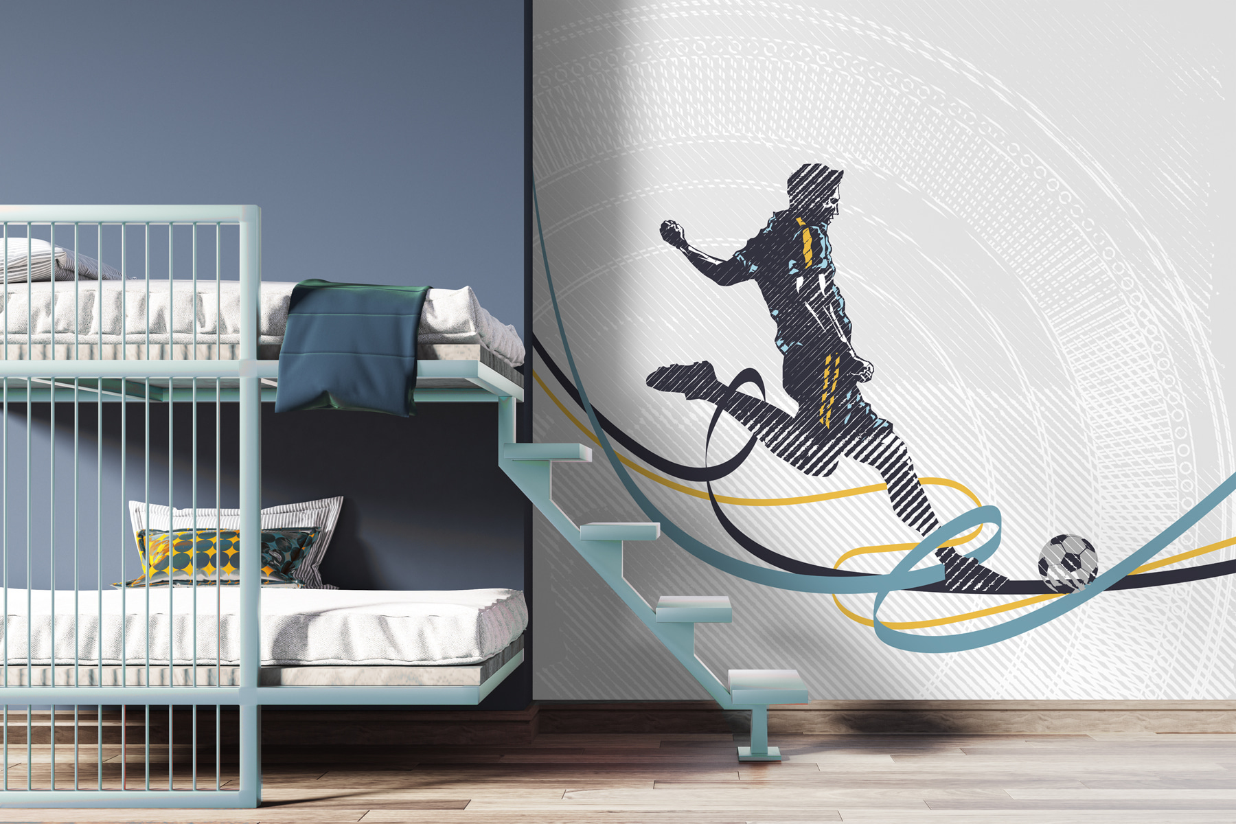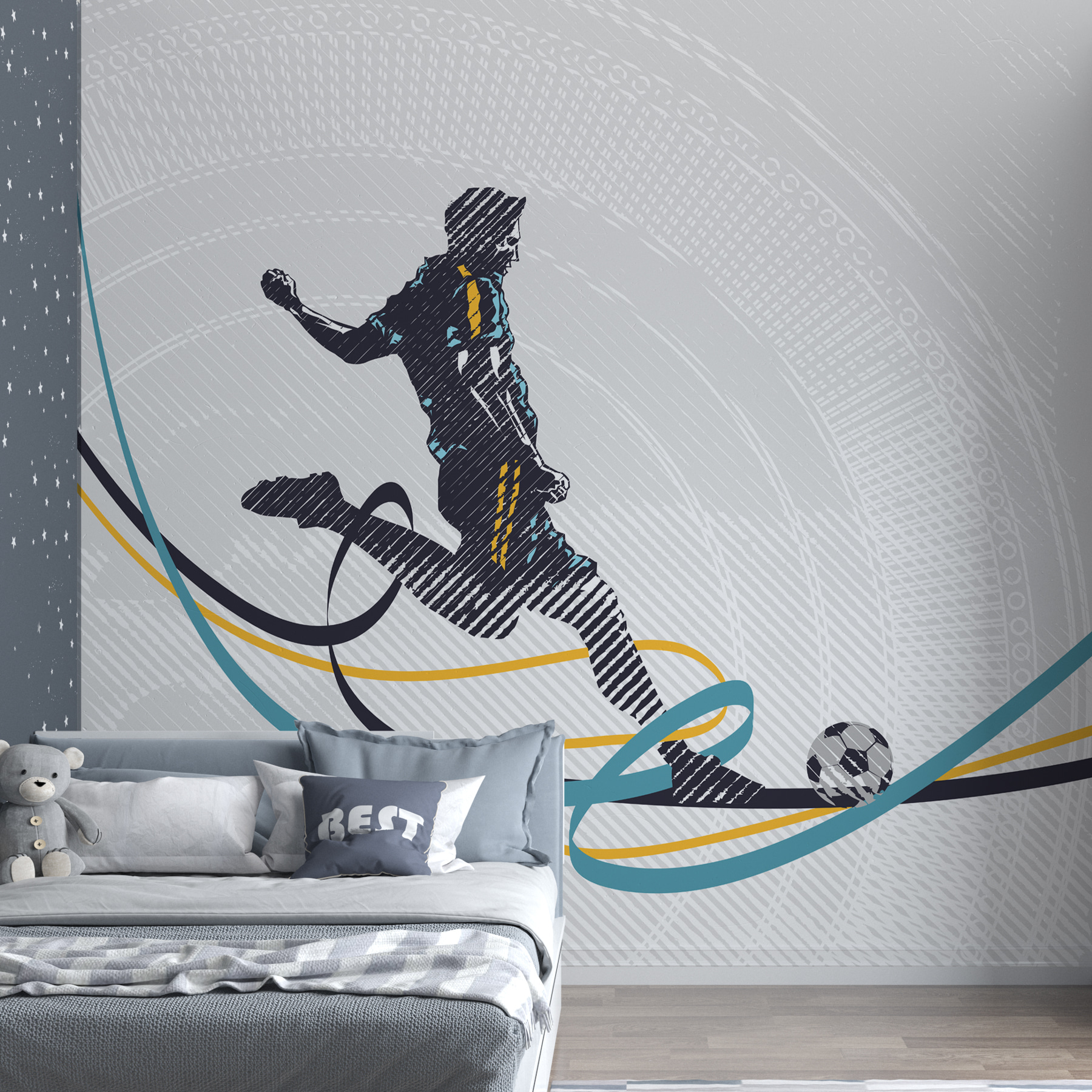 Az absztrakt vonalak és az élénk színek keveréke hűvös, modern hangulatot kölcsönöz neki, amely valahogy mégis meleg és hívogató. Olyan, mintha örökre megörökítene egy tökéletes sportpillanatot. És hé, nem kell aggódnod a pontszerzés miatt a dekorációs játékban – ez a falfestmény biztosan az élre repít! A színfoltok mindent feldobnak. Tökéletes minden futballrajongónak, vagy annak, aki egyszerűen csak szereti a jó akciófotókat.