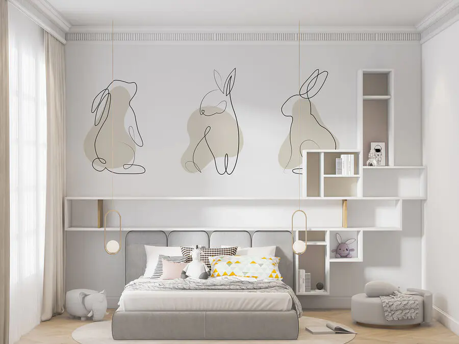 Ó, imádni fogod ezt a falfestményt! A címe “Egy nyúl vonalrajza”, és olyan, mintha a szeszély és a minimalizmus tökéletes illata lenne egyben. Képzeld el, ahogy a reggeli kávét kortyolgatva ezeket az aranyos kis nyuszikat nézegeted. Van ez az egyszerű vonalművészeti hangulat, amitől valahogy minden könnyedebbnek és derűsebbnek tűnik.