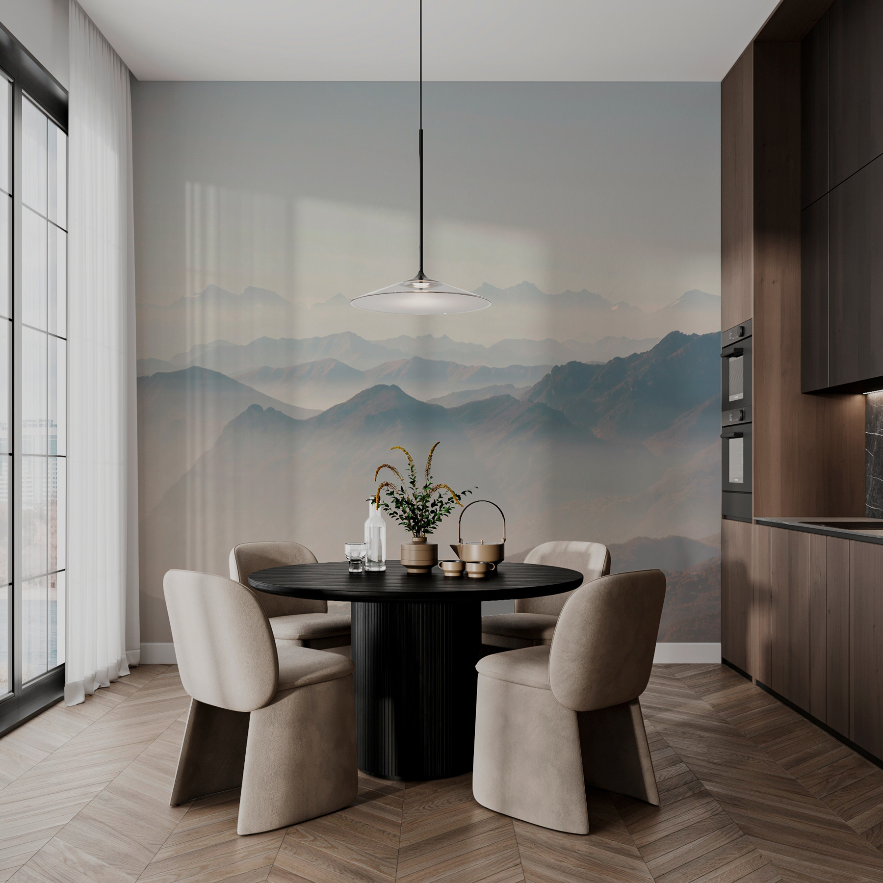 Bármilyen teret alakítson át nyugodt meneküléssé ezzel a lenyűgöző, ködbe burkolózott hegyvonulatot ábrázoló falfestménnyel. Képzelje el, ahogy egy lusta vasárnap reggelen kávét kortyolgatva bámulja ezeket a lágy, hullámzó hegycsúcsokat. Olyan ez, mint egy minivakáció a falakra. A tompa színek nyugalmat idéznek, tökéletes egy hangulatos nappaliba vagy egy nyugodt hálószobába. Képzelje el, hogy ez a falfestmény olyan hátteret teremt, amely a friss levegőről és a hegyi túrákról ábrándozik, mindezt túrabakancs nélkül. Ez egy olyan dekoráció, amely történetet mesél, és a természetet a kaland suttogásával hozza be a házba.