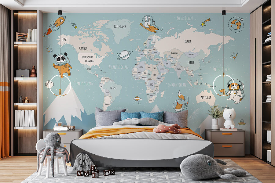 Képzelje el a kalandot anélkül, hogy elhagyná a házat! Íme egy falfestmény, amely egy világtérkép, megspékelve imádnivaló hegycsúcsokkal, pelyhes felhőkkel, és a legaranyosabb kis űrhajósokkal és az űrt felfedező kisállatokkal. Tökéletes gyerekszobába vagy gyerekszobába, egyszerre szórakoztató és tanulságos. A kicsik távoli helyekről és űrkalandokról álmodozhatnak – kinek van szüksége esti mesére, amikor a falak maguk mesélnek? Ez a falfestmény izgalommal és kíváncsisággal kelti életre a szobát. Ez nem csupán dekoráció; mindennapos kalandozás a kis felfedezők számára. Ráadásul azok a színek és szeszélyes rajzok? Teljesen hangulatosak és hívogatóak. Olyan, mintha az egész szobát egy meleg, fantáziadús ölelésbe burkolná.