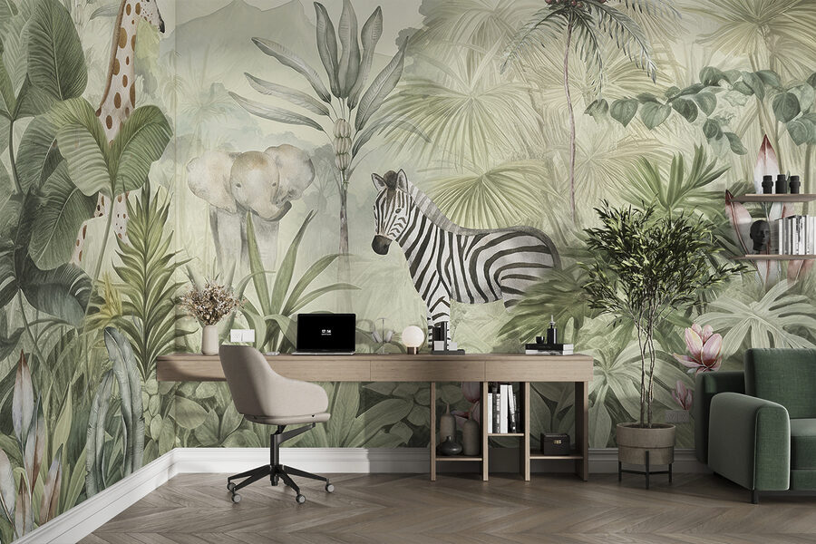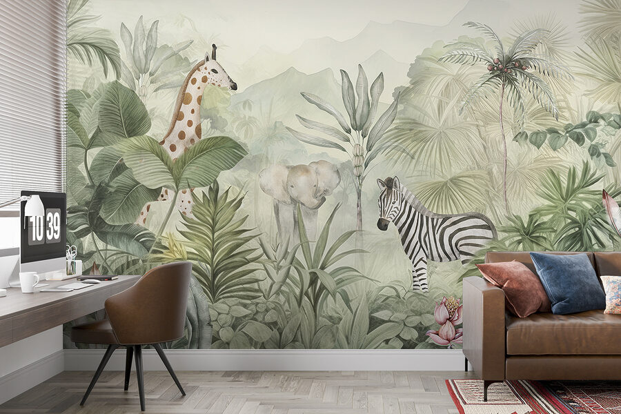 Képzelje el, hogy egy élettel teli dzsungelbe lép – de a saját szobájában! Ez az “Animals Roam Tranquil Jungle Landscape” falfestmény tiszta varázslat a szemnek. Elefántok, zebrák és zsiráfok békésen bolyonganak ebben a buja zöldben, amely olyan élénk, hogy szinte érezni fogod a páratartalmat! Ideális gyermekeknek és csecsemőknek, a kaland és a nyugalom megnyugtató keveréke, amely a legvadabb képzeletet is beindítja. A lágy pasztellszíneknek és a bonyolult részleteknek köszönhetően bármilyen térben megállja a helyét. Tökéletes a természet szerelmeseinek vagy azoknak, akik csak el akarnak menekülni – anélkül, hogy elhagynák az otthonukat.