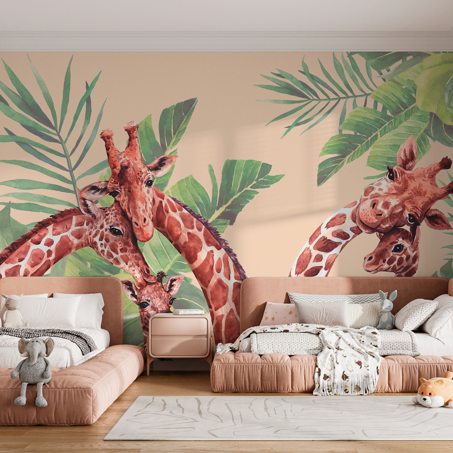 Képzelje el, hogy hazaérve egy olyan nappaliba érkezik, ahol zsiráfok fogadják minden nap! Ez a “Zsiráfcsoport levelekkel” falfestmény a magas, szelíd óriások játékos ölelésébe burkol, és bájjal és szeszélyességgel kelti életre a falakat. Tökéletes gyerekszobákba vagy bármely olyan helyiségbe, ahol szükség van egy kis bájos vadállati hangulatra! A vibráló zöldekkel és földszínű zsiráf-árnyalatokkal olyan érzés, mintha egy mini szafarin lennél otthon. Képzeld el a reggeli kávét, érezd a dzsungel hangulatát, és talán még nevet is adhatsz új zsiráfpajtásaidnak. Bármilyen falat kalanddá varázsol. 🌿🦒