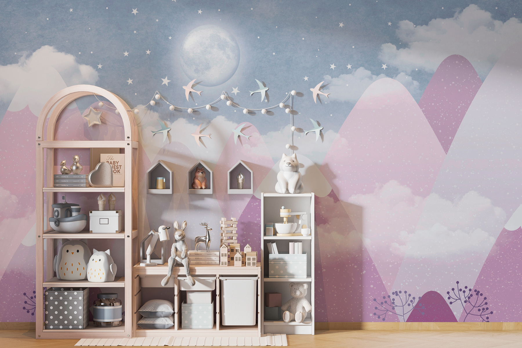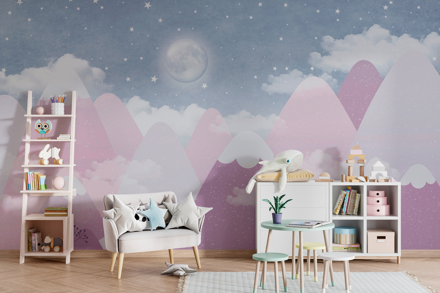 Alakítsa át terét a “Telihold az égen” falfestménnyel, amely egy álomszerű tájba való lenyűgöző menekülés. Képzelje el: lágy, pasztellszínű hegyek emelkednek lágyan a hatalmas égbolt alatt, amelyet játékos felhők és csillogó csillagok tarkítanak. Talán azon kapja magát, hogy álmodozik, vagy egy könyvvel bújik össze, és érzi, hogy a derűs hangulat átjárja. Ez a falfestmény nem csak a falon lóg – arra hívja Önt, hogy szusszanjon egyet, lélegezzen egyet, és engedje el a képzeletét. Tökéletes választás nappaliba, gyerekszobába vagy bárhová, ahol elkelne egy kis varázslat. Ki ne szeretne minden nap elrepülni ebbe a nyugodt jelenetbe?