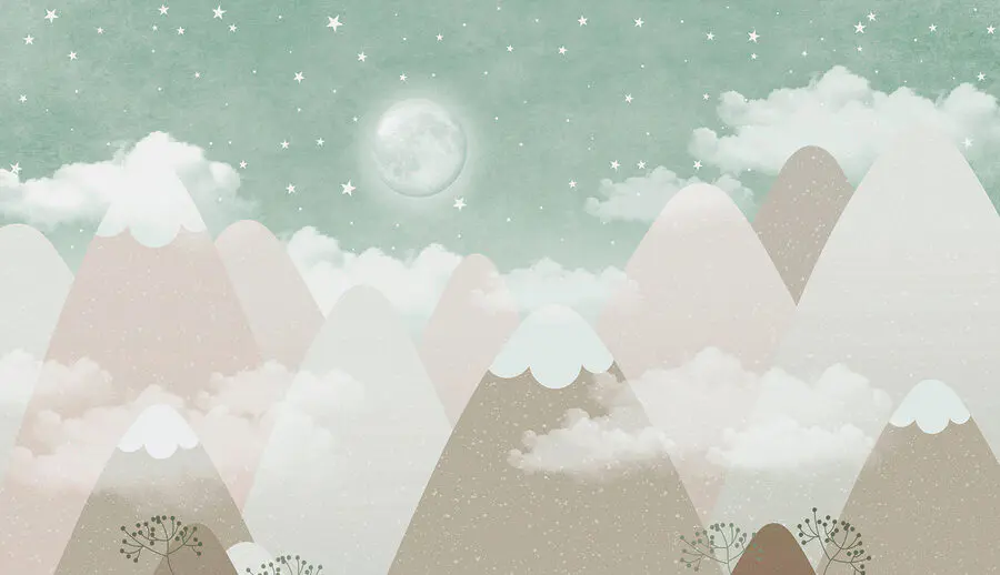 A lágy színek és a szeszélyes hegyi formák nyugtató hangulatot árasztanak. Könnyen elveszhetsz ebben a nyugodt jelenetben, ahol a hold szelíd őrzőként lóg, és felügyeli az álmodat. A csillagok – ó, a csillagok! Lágyan pislákolnak, és a csodálkozás apró pillanatait idézik fel. Komolyan, csak képzelje el a mesét vagy az alvásidőt e bájos háttér mellett!