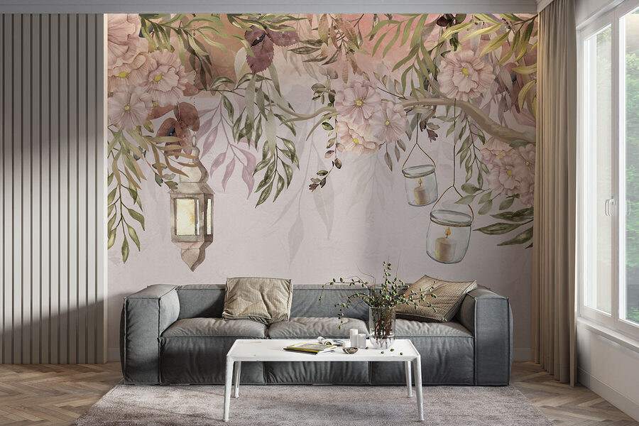 Képzelje el, hogy egy szeletet kap egy álomszép kerti sarokból közvetlenül a falán. Ez a falfestmény, “Lámpások és virágok álomszerű jelenetet teremtenek”, olyan, mintha egy nyugodt tündérmesébe lépnél minden alkalommal, amikor belépsz a szobába. A lágy rózsaszín bazsarózsák és a buja zöld lombok egy kis természetet varázsolnak a belső térbe, olyan teret teremtve, amely egyszerre megnyugtató és inspiráló. A lámpák hangulatos, meleg hangulatot árasztanak – szinte olyan, mintha hallanád a levelek lágy zizegését és éreznéd a friss virágok illatát.