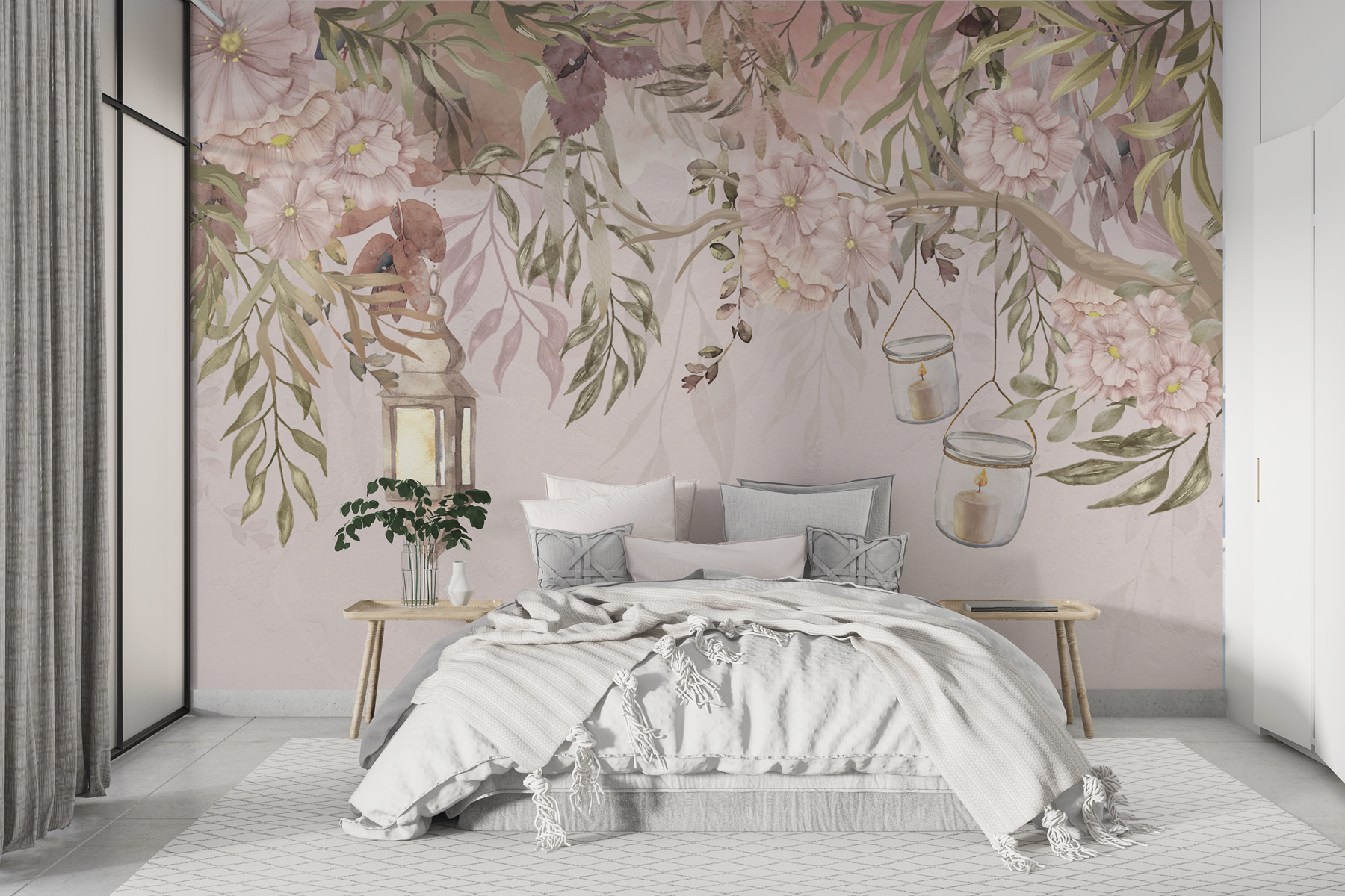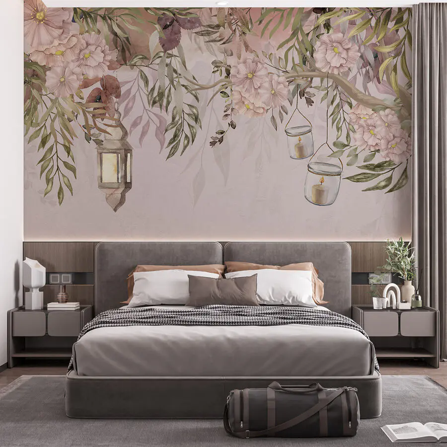 Képzelje el, hogy egy szeletet kap egy álomszép kerti sarokból közvetlenül a falán. Ez a falfestmény, “Lámpások és virágok álomszerű jelenetet teremtenek”, olyan, mintha egy nyugodt tündérmesébe lépnél minden alkalommal, amikor belépsz a szobába. A lágy rózsaszín bazsarózsák és a buja zöld lombok egy kis természetet varázsolnak a belső térbe, olyan teret teremtve, amely egyszerre megnyugtató és inspiráló. A lámpák hangulatos, meleg hangulatot árasztanak – szinte olyan, mintha hallanád a levelek lágy zizegését és éreznéd a friss virágok illatát.