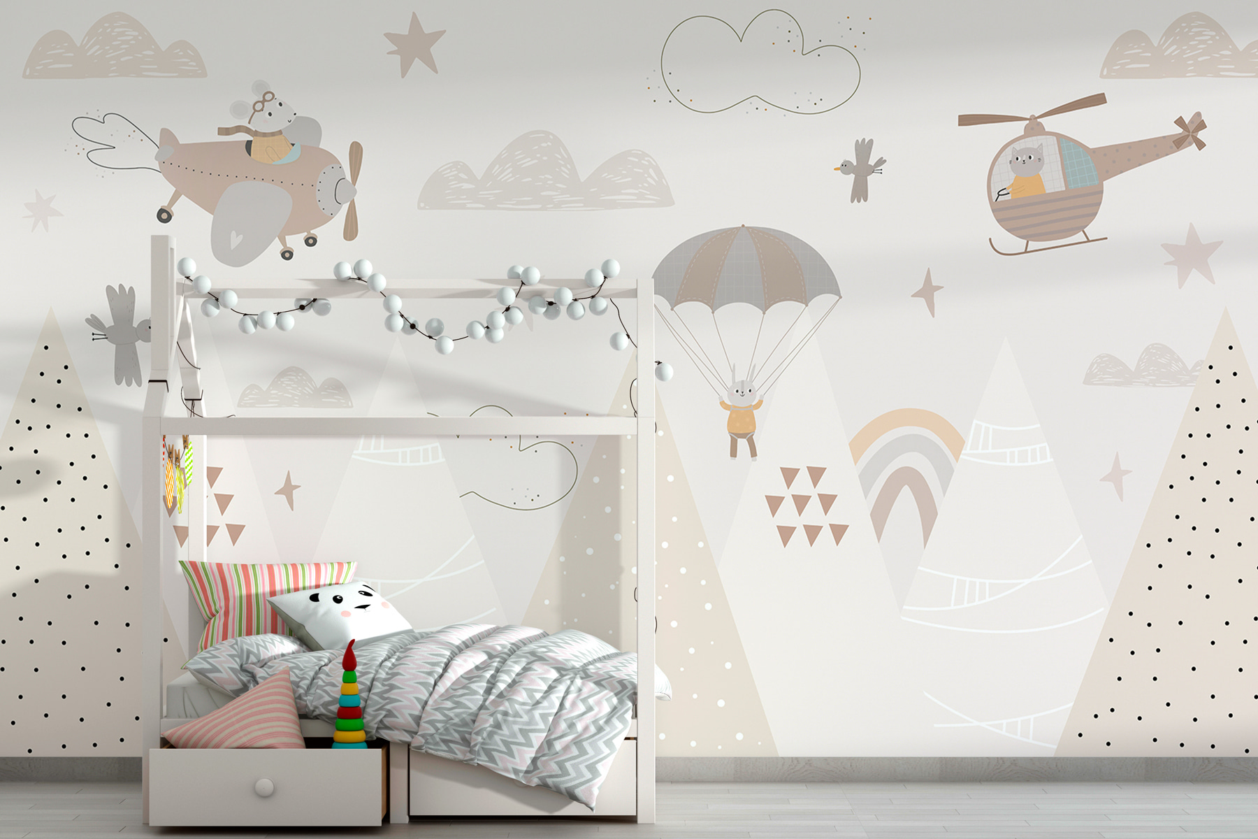 Miért ne hagynád, hogy ez az imádnivaló falfestmény elrepítsen téged és kisgyermekedet a fantázia szárnyalásának földjére? Hangulatos, elbűvölő, és biztos, hogy órákig tartó kalandozásra inspirál.