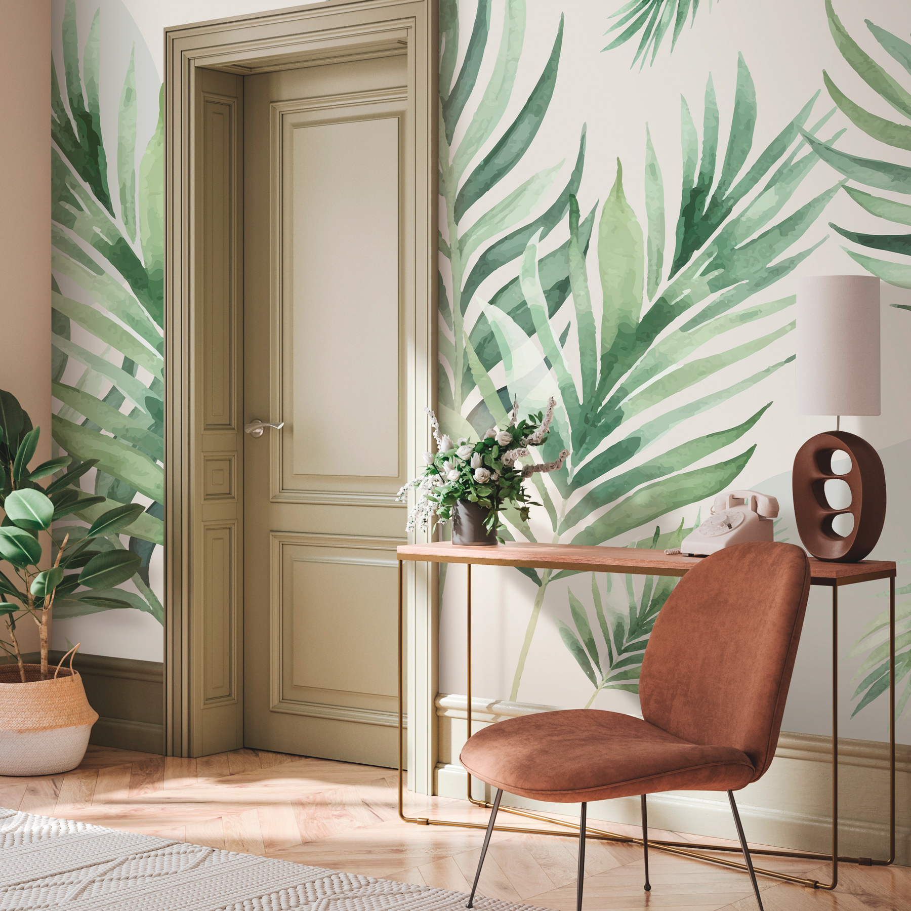 Bármilyen teret alakítson át trópusi menedékké ezzel a lágy akvarell levelekből álló varázslatos falfestménnyel. Képzelje el, hogy minden reggel arra ébred, hogy a pálmalevelek lágy ringatózása táncol a falán, mintha egy békés tengerparti üdülőhelyen nyaralna. A finom zöldek nyugalmat árasztanak, könnyedén feldobják otthonát – naptejre nincs szükség! Képzeljen el egy hangulatos olvasósarkot, ahol kávéját kortyolgatva bámulhatja ezt a buja tájat. Olyan, mintha egy kicsit a dzsungelt hoznád befelé, a szúnyogok nélkül. Tökéletes azoknak, akik vágynak a természetre, de szeretnek otthon maradni.