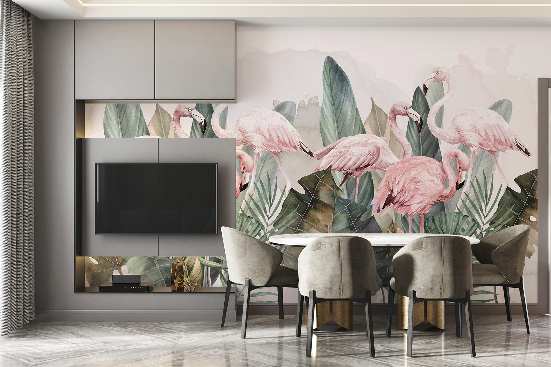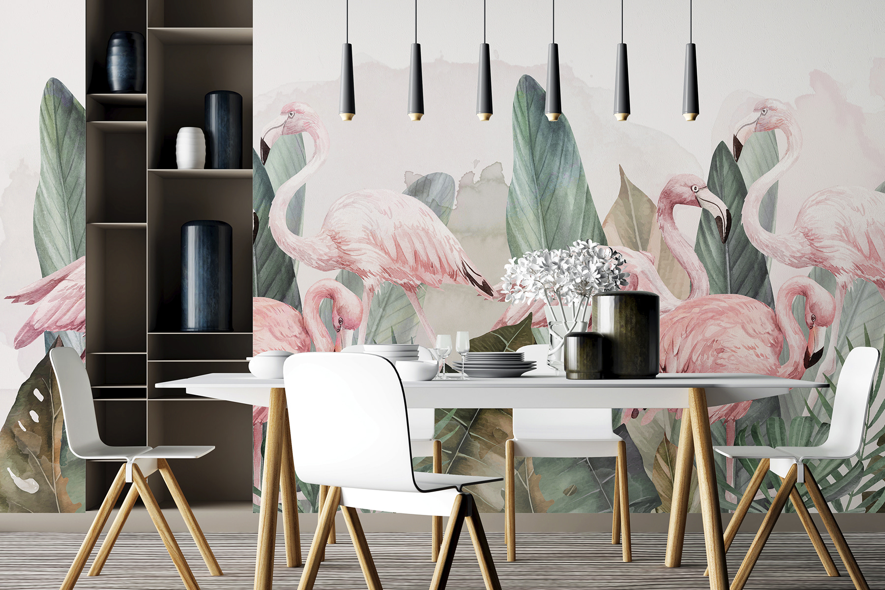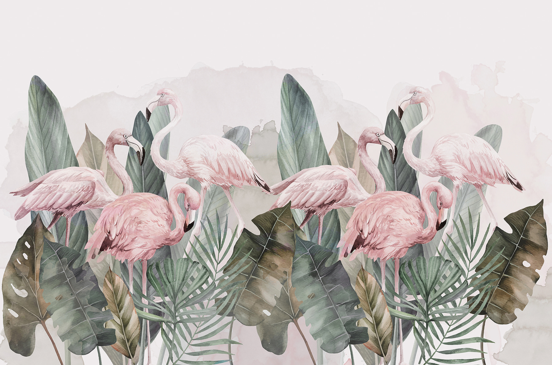 A lágy rózsaszín és zöld színek nyugtató hangulatot árasztanak. Olyan, mintha egy kis dzsungelt hoznál az otthonodba, a bogarak nélkül! Akár a hálószobáját dobja fel, akár az irodáját szeretné feldobni, akár a gyerekeknek szeretne egy játékos teret kialakítani, ez a falfestmény tudja, hogyan kell kijelentést tenni. Ráadásul ki ne szeretné a flamingókat? Hóbortosak, viccesek és egyszerűen gyönyörűek.