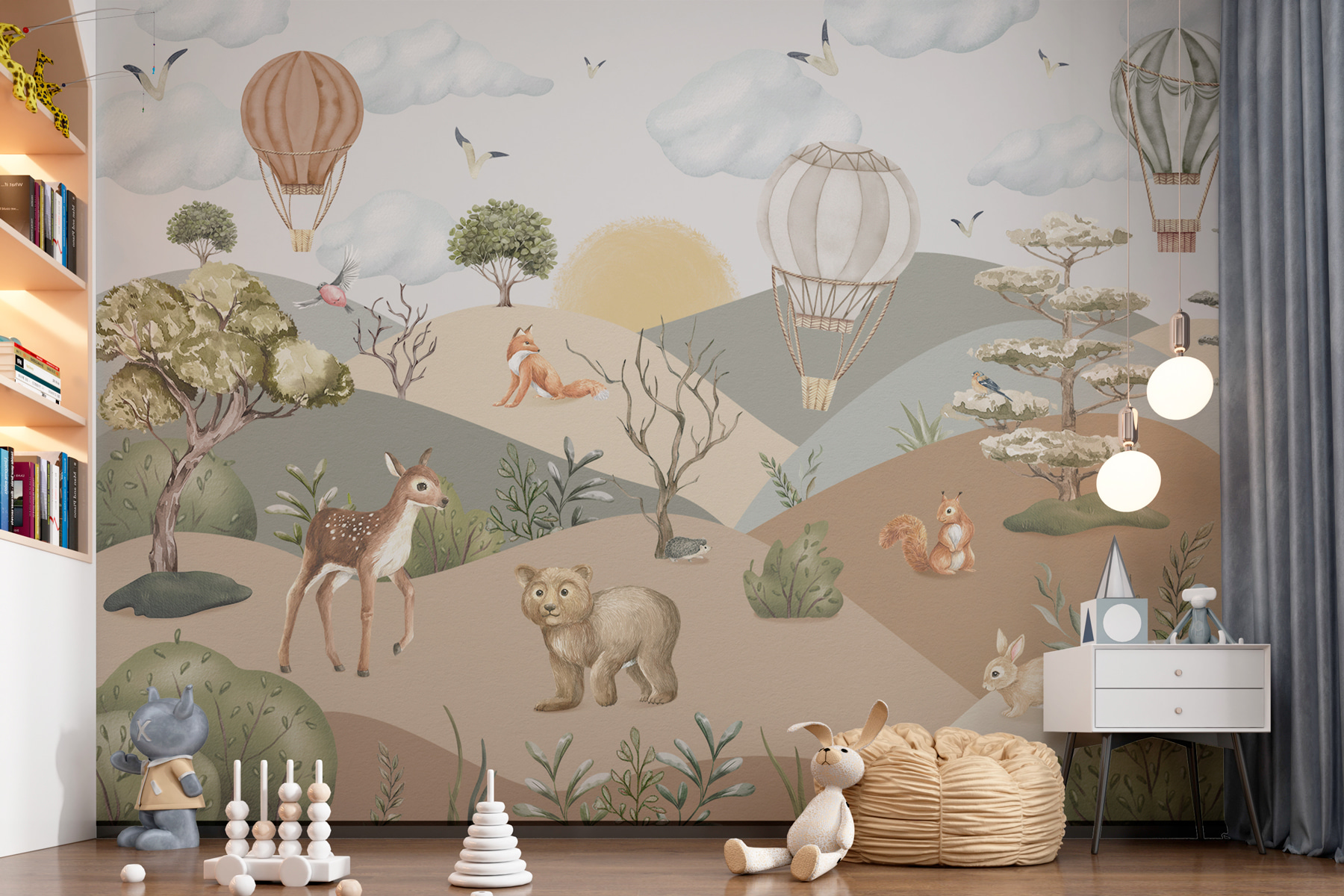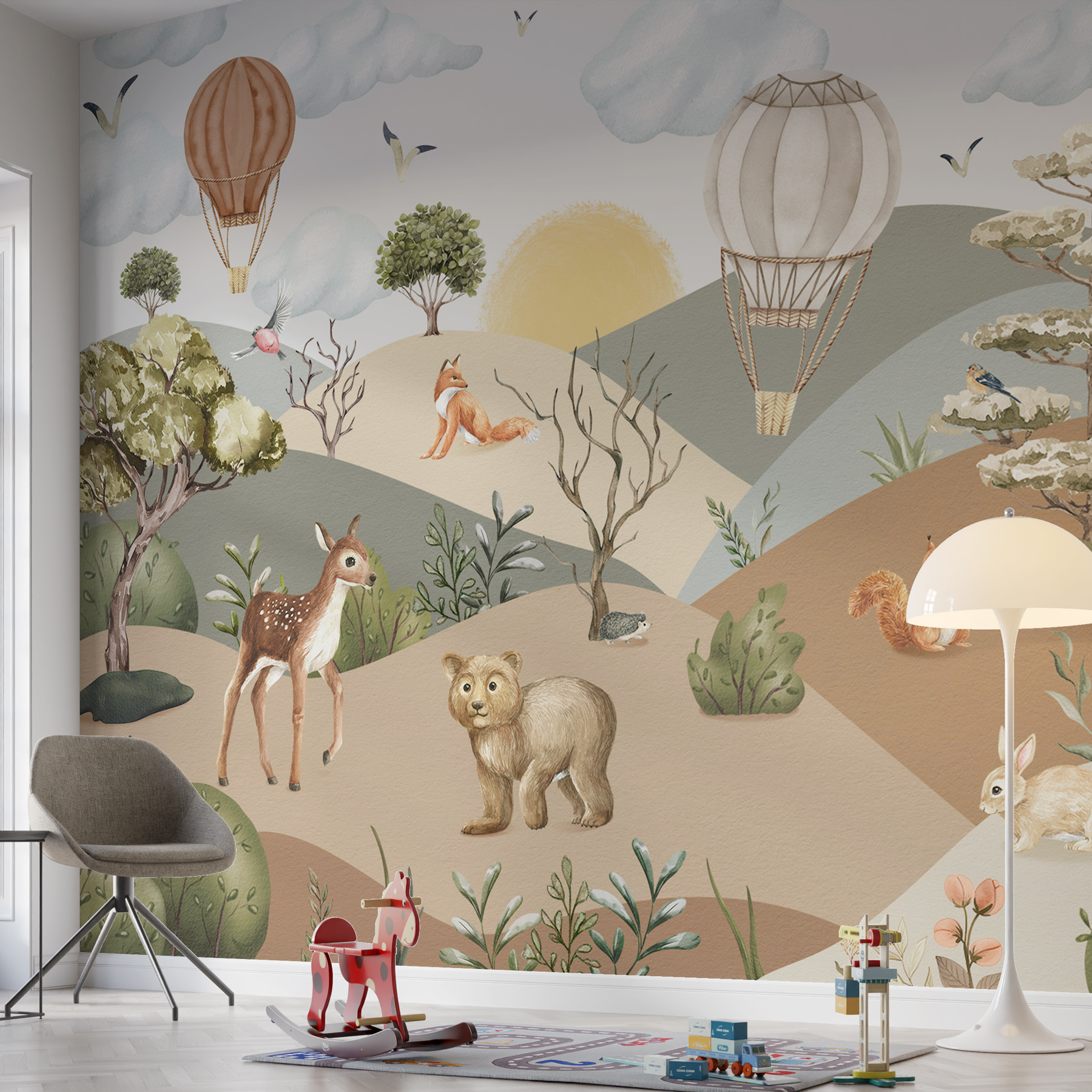 Alakítsd át a szobát szeszélyes kalanddá ezzel a magával ragadó falfestménnyel! Olyan, mintha egy álomszép tájra lépnél, ahol az állatok – gondolj a kíváncsi szarvasokra és a játékos rókákra – a bájos hőlégballonokkal tarkított égbolt alatt szaladgálnak. Tökéletes egy gyerekszobába vagy egy pihentető zugba, tele vidám vonásokkal. Képzeld el, hogy egy szelíd medve tekintetére vagy egy vidáman csámcsogó mókusra ébredsz. A tompa tónusok és a játékos karakterek békés hangulatot teremtenek, miközben fantáziát és örömöt ébresztenek. Ráadásul fantasztikus beszélgetésindító!