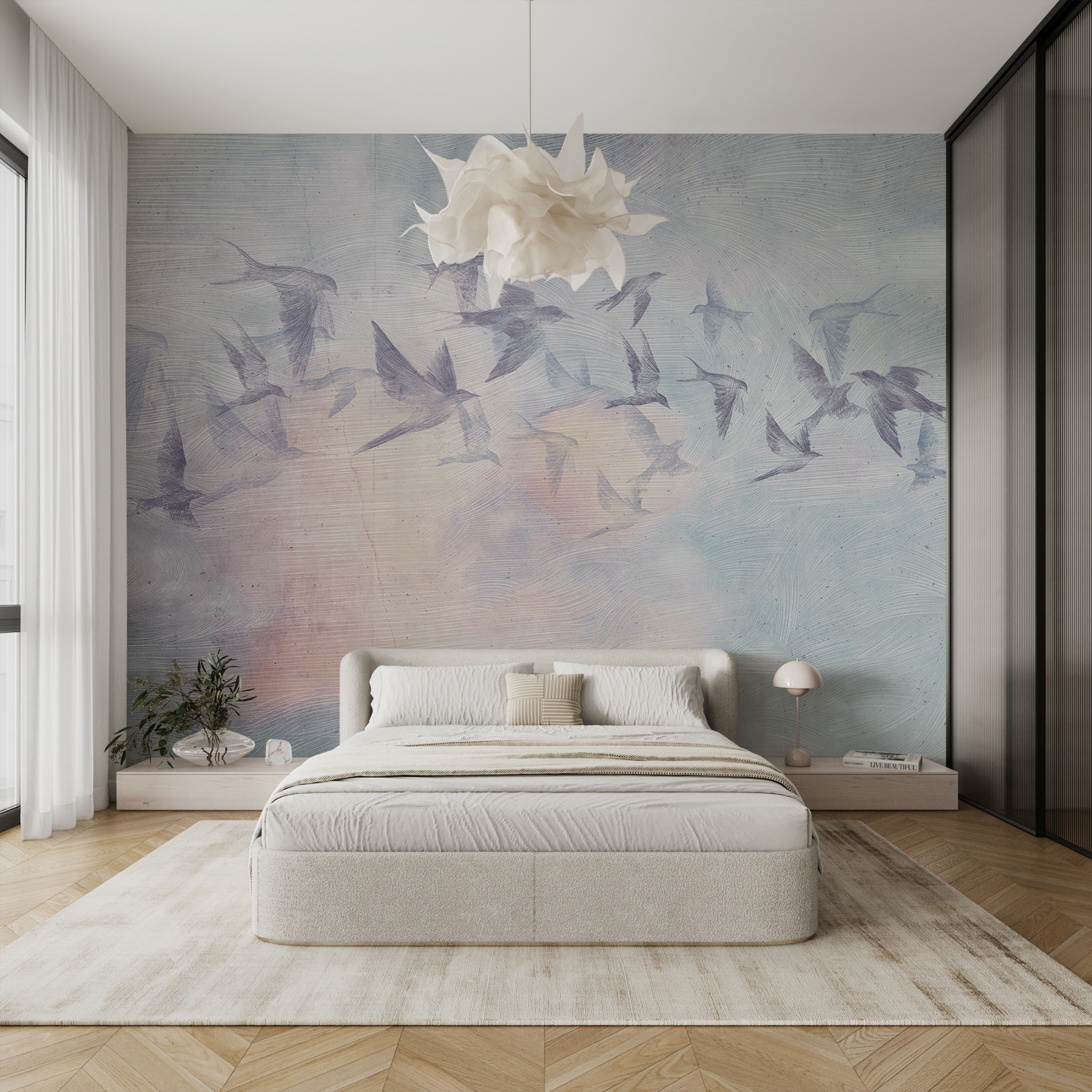 Képzelje el, hogy álomszerű akvarellekkel festett, finom madarak nyugodt látványára ébred, amelyek a falon repkednek. Pontosan ezt kínálja a “Flock of Birds Flying in the Sky” falfestmény. Ez nem csak egy műalkotás – ez egy békés álomkép, amely a természet szelíd áramlását örökíti meg.