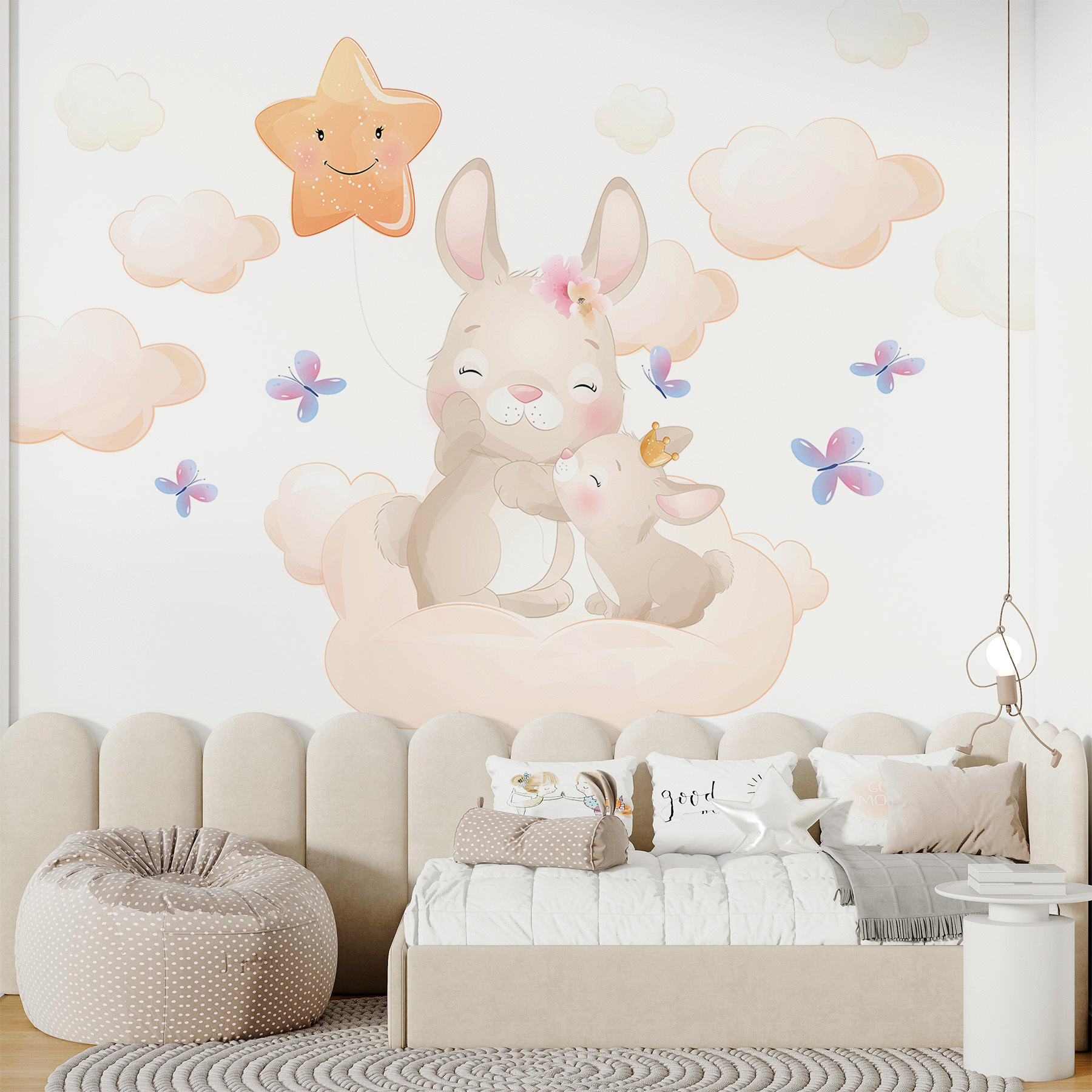 Képzeld el, hogy belépsz egy szobába, ahol szeszélyes nyuszik, álmodozó felhők és egy boldog csillag üdvözölnek téged egy szelíd mosollyal – tiszta varázslat, igaz? Ez a falfestmény, a “Cartoon of a Star”, egy csipetnyi csillagport és rengeteg bájt visz bármelyik térbe. A pasztellszínű felhők már-már olyan pelyhesnek tűnnek, hogy szinte megérinthetjük őket, és azok a pillangók? Csak úgy röpködnek, hogy köszönjenek. Olyan, mintha egy tündérmesébe lépnénk, tökéletes gyerekszobákba vagy játszószobákba, ahol a képzelet virágzik. A lágy színek és a bájos figurák olyan érzést keltenek, mintha gyengéd ölelés lenne a falakon. Ideális az esti mesékhez, vagy egyszerűen csak egy kis csodát varázsol a mindennapokba.