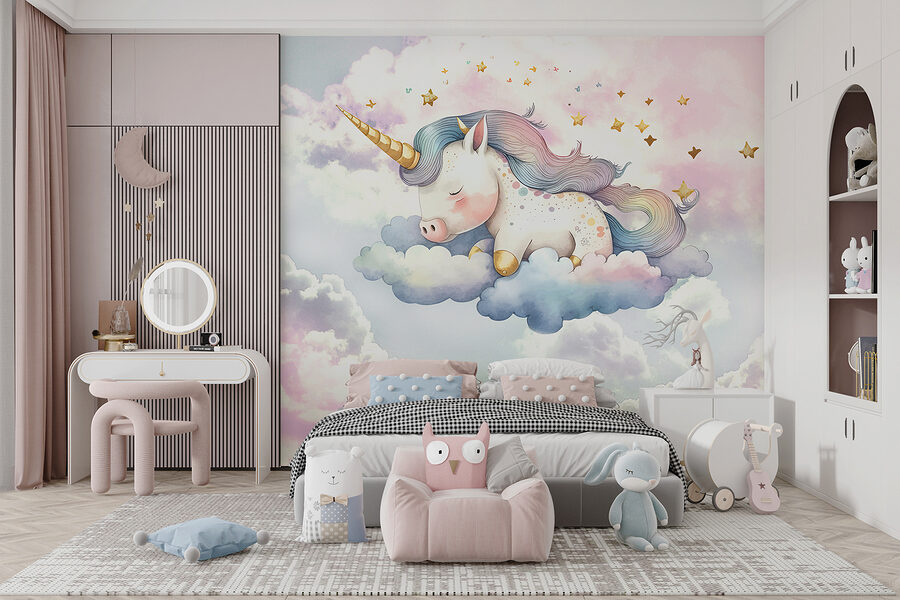 Nézd meg ezt az álomszép “Felhőkön alvó egyszarvú” falfestményt! Komolyan, olyan, mintha egy bolyhos, varázslatos álomvilágba lépnél, valahányszor belépsz a szobába. Képzeld el, hogy a kedvenc hangulatos helyeden most egy szuper cuki, szunyókáló egyszarvút láthatsz puha, puffos felhőkön – micsoda hangulat, nem igaz? Tökéletes, ha egy kis varázslatot szeretnél varázsolni a gyerekszobába vagy akár a saját kis olvasósarkodba.