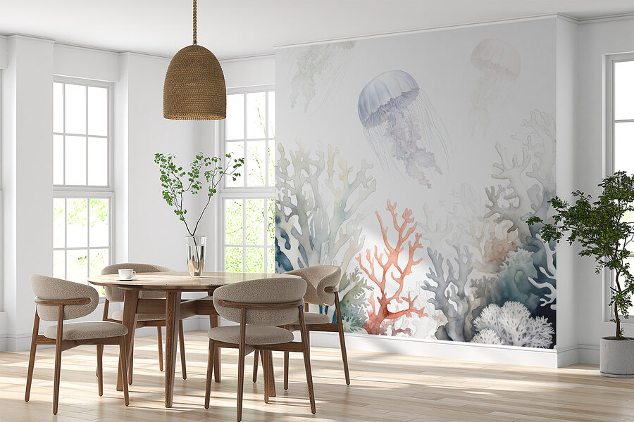 Képzelje el, hogy egy békés víz alatti csodavilágban úszik. Ez a “Medúza színes korallok felett sodródik” falfestmény pontosan ezt a hangulatot varázsolja a helyiségedbe. Olyan, mintha az óceán suttogása lenne a falakon! A lágy, akvarell színárnyalatok nyugalmat árasztanak – szinte mintha hallaná a tenger lágy ringatózását. Tökéletes mindenkinek, aki szereti a tengerparti bájt, és igazi beszélgetésindító. Helyezkedjen el ebben a nyugodt jelenetben, és hagyja, hogy gondjai elszálljanak ezekkel a gyönyörű medúzákkal. Egy színfolt és nyugalom az otthonában!