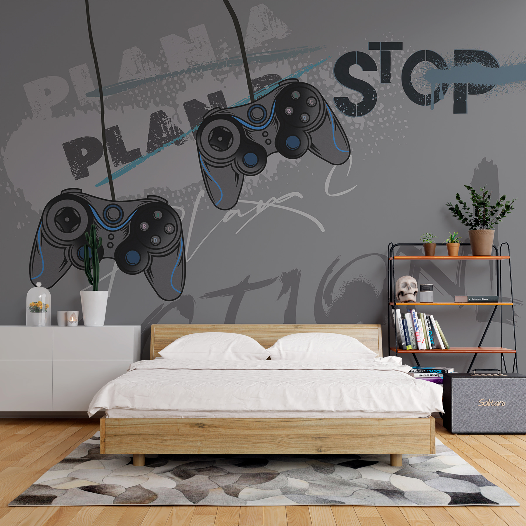 Változtasson bármelyik szobát élénk játékparadicsommá ezzel a falfestménnyel, amely merész videojáték-vezérlőket ábrázol egy elegáns szürke háttér előtt. Ez nem csak egy dizájn; ez egy felhívás a cselekvésre a késő esti játékülések és az epikus győzelmek alkalmával. Képzelje el ezt: egy hangulatos helyiség, ahol a barátok összegyűlnek, a rágcsálnivalók karnyújtásnyira vannak, a nevetés betölti a levegőt, és a szemek a képernyőre szegeződnek – ez a falfestmény megadja a tökéletes hangot. A játékos “PLAN” és “STOP” művészet a szórakozást és az energiát ötvözi, emlékeztetve mindenkit, hogy minden pillanat számít, játékban és játékon kívül egyaránt. Ideális egy játékszobába, egy fiatal játékos hálószobájába vagy akár egy vidám élettérbe. Miért ne ölelnéd magadhoz a játékos szellemet?