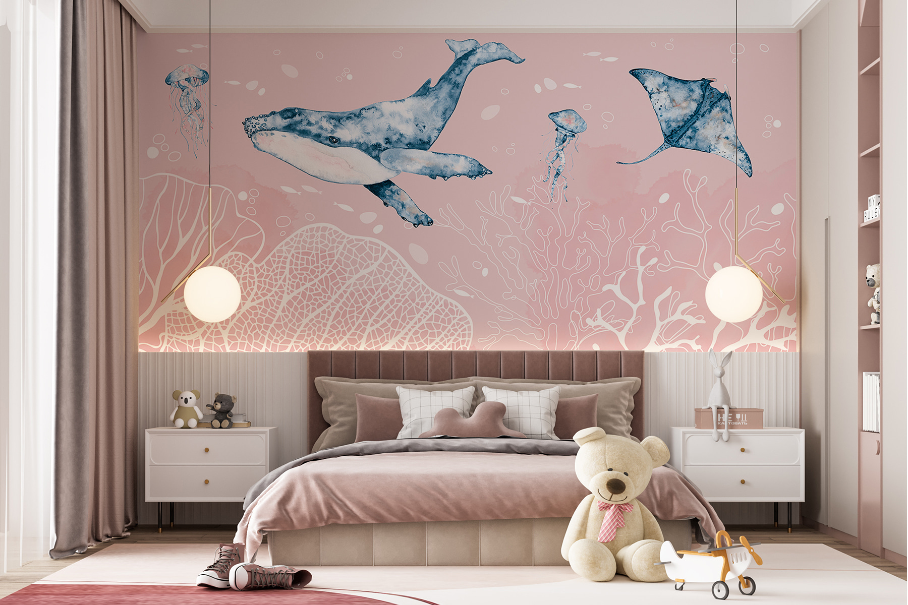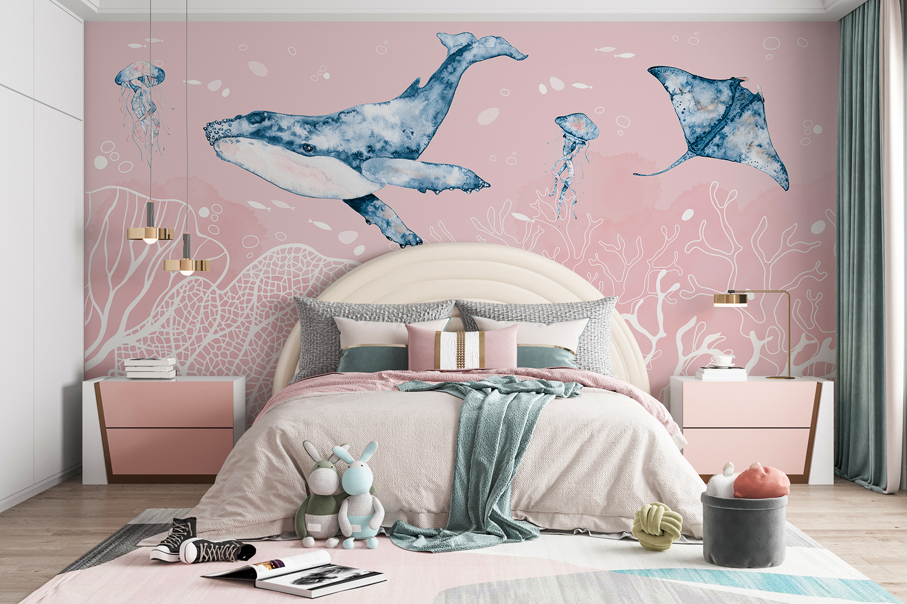 Képzelje el, hogy belép egy szobába, és egy nyugodt víz alatti világban találja magát. A “Bálna akvarellje” falfestményünk olyan, mintha az óceán egy szelete lenne a falon. Az álmodozó pasztellszínek könnyedén keverednek, nyugalmat és szeszélyességet árasztva. Egy elegáns bálna, kecses medúzák és kíváncsi ráják lebegnek körülötted, és olyan érzést keltenek benned, mintha egy varázslatos tengerbe csöppentél volna.