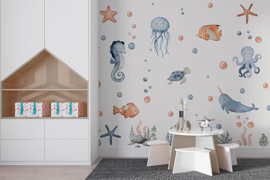 A “Csillagok és buborékok” falfestmény segítségével bármelyik szobát szeszélyes víz alatti kalanddá varázsolhatja. Képzeld el a bájos tengeri lények bájos felvonulását – csikóhalak, vidám medúzák, sőt még egy barátságos narvál is táncol a puha buborékok között. Olyan, mintha az óceán egy darabját hoznád be az otthonodba! Tökéletes gyerekszobákba vagy tengerparti témájú helyiségekbe, ez a falfestmény vidámságot és hangulatot kölcsönöz. Képzeld el, ahogy a nevetés és a képzelet szárnyal, miközben a kicsik saját történeteket találnak ki ezekről a víz alatti cimborákról. Szelíd emlékeztető a tenger játékos szellemének elfogadására!