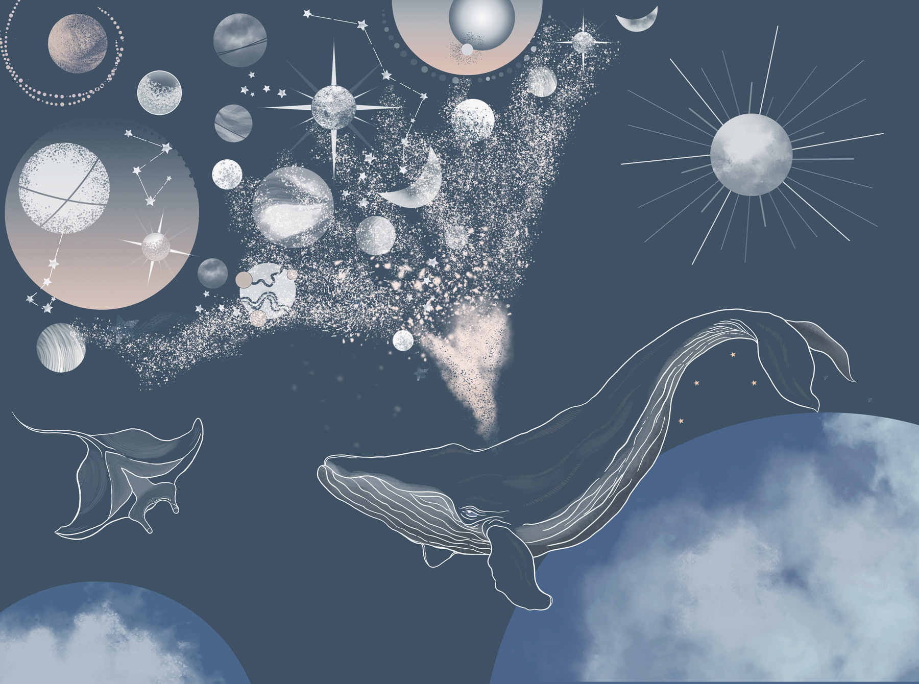 A “Fotótapéta Moon and the Moon” egyike azoknak a daraboknak, amelyek egyenesen egy álomba repítenek. Képzeld el, hogy a szobád egy víz alatti csillagvizsgálóvá válik. Igen, így van. Ez a falfestmény egy fenséges bálnát ábrázol, amely egy kozmikus jeleneten keresztül cirkál, körülötte bolygók, csillagok és holdfázisok lebegnek – olyan, mintha az óceán találkozna az univerzummal! Tökéletes ahhoz, hogy varázslatos hangulatot kölcsönözzön bármilyen térnek. A vendégek elmerülhetnek a csillagképek követésében, és elképzelhetik az egyes égi objektumok mögött rejlő történetet. Ez egy beszélgetésindító, egy látványosság és egy hangulatos visszavonulás egyben. Merüljön el, és hagyja, hogy a falak szeszélyes mesét meséljenek!