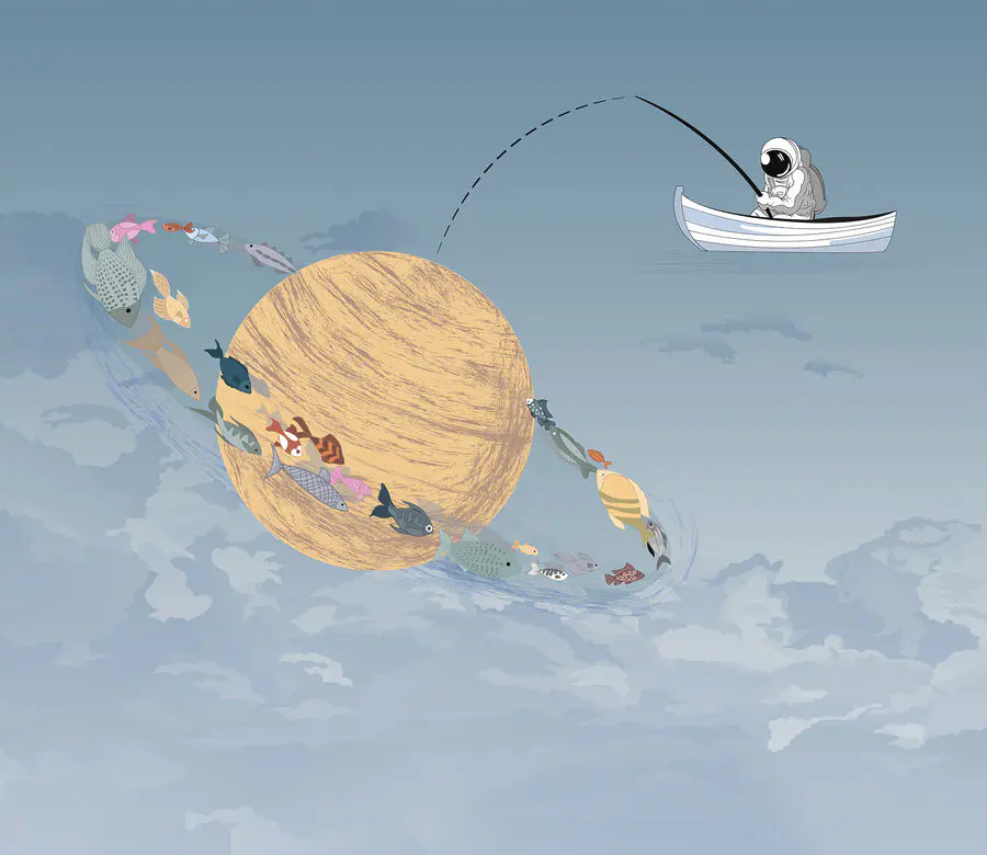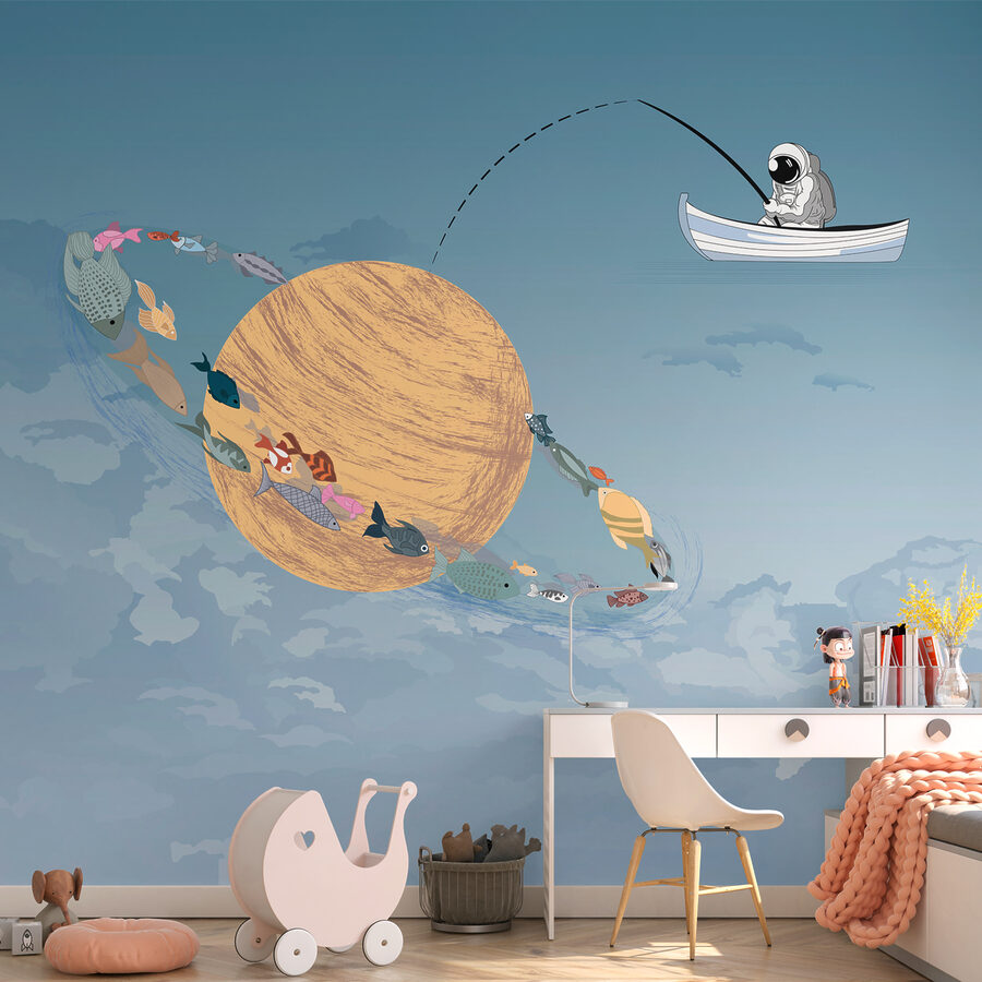 Képzelj el egy hangulatos kis horgásztúrát, de a nyugodt tó helyett a felhők között lebegsz. Ez a falfestmény ezt az álmot kelti életre. Képzelj el egy szeszélyes jelenetet egy csónakban horgászó férfiról, aki az égben halászik, és színes halak úszkálnak egy óriási, örvénylő bolygó körül. A világos kékek és a lágy fehérek nyugodt hangulatot teremtenek, amely tökéletes az álmodozáshoz. Olyan, mintha egy titkos kaland várna a fejed felett. Tökéletes gyerekszobába vagy kreatív térbe, beindítja a fantáziát, és vidám csavart ad bármelyik falnak. Ki ne szeretne egy vonalat a felhők közé vetni?