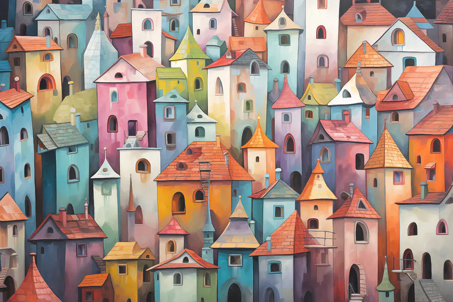 Változtasson bármelyik falat élénk utcai jelenetté ezzel a színes épületeket ábrázoló falfestménnyel. Képzeld el, hogy egy szeszélyes faluba lépsz, ahol minden egyes épület a saját történetét meséli el, vibráló árnyalatok táncolnak a fényben. Képzelj el egy hétvégi baráti összejövetelt, ahol a nevetés visszhangzik, miközben megcsodálják ennek a műalkotásnak a játékos báját. Olyan, mintha egy kis vidámságot hozna a nappalidba – vagy a konyhádba, vagy bárhová, ahová csak szeretnéd! Tökéletesen felrázza az unalmas teret, és egy csipetnyi varázslatot ad, amely mindenkit mosolyra fakaszt. Ki ne érezné magát inspirálva egy színfolt által?