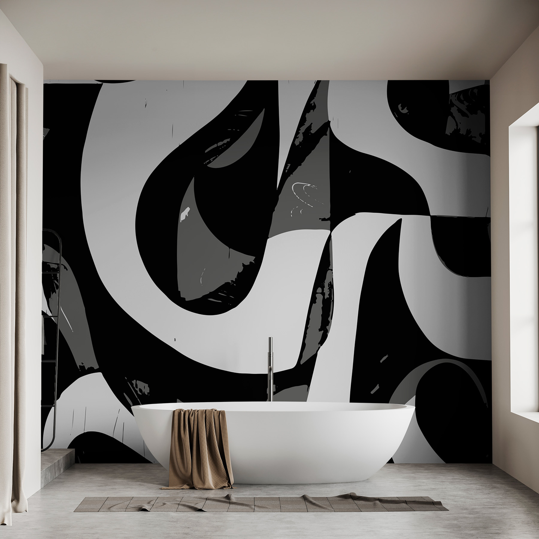 Ez a fekete-fehér falfestmény egyedivé varázsolja a teret, és játékos, kavargó mintával táncol a falon, mintha a hely az övé lenne. Képzelje el, hogy belép a szobába, és egy olyan műalkotás fogadja, amely egyformán modern és szeszélyes. Ez az a fajta dizájn, amely beszélgetésre késztet – a barátok talán még kétszer is megnézik, miközben próbálják kitalálni, hogy melyik alakzat érdekli őket a legjobban.