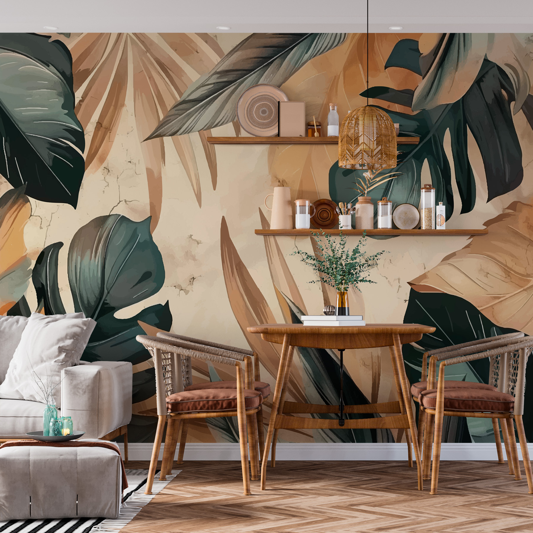 A textúrák a fa és az elöregedett falak kopott báját utánozzák, rusztikus, mégis vibráló hangulatot kölcsönözve. Ideális egy hangulatos olvasósarok vagy egy hűvös lógós hely kialakításához, ahol szinte hallani lehet a levelek zizegését és a trópusi madarak távoli hívását. Olyan, mint egy minivakáció a falakon – naptej nélkül.