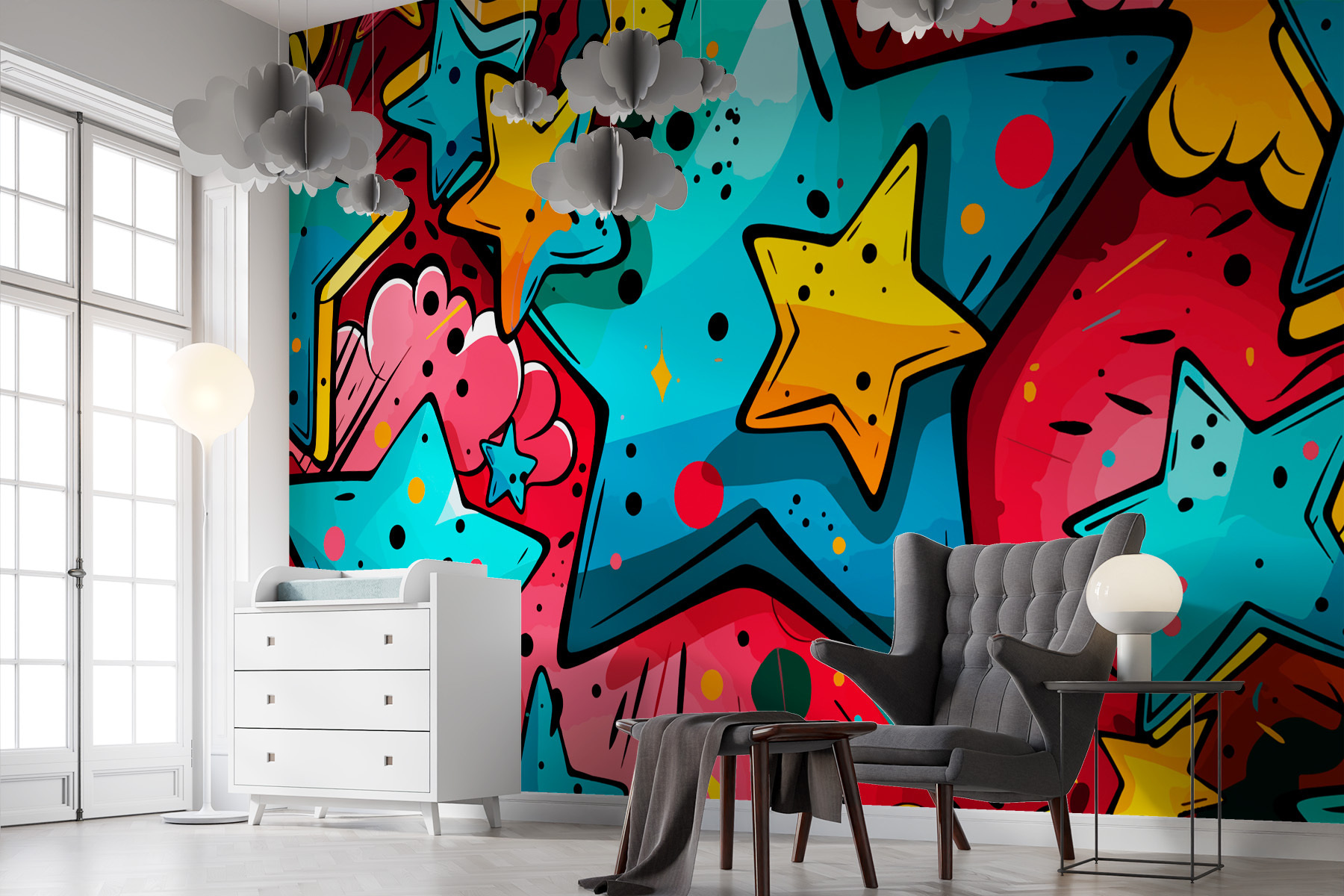 Képzelje el, hogy belép egy szobába, és azonnal egy szeszélyekkel és csodákkal teli galaxisba kerül. Ezt teszi a “Színes csillagmintás” falfestmény. Olyan, mint egy soha véget nem érő buli a falon! A vibráló csillagokkal és játékos színpompákkal teli falfestmény tökéletes mindenkinek, aki egy kis vidámságot szeretne a helyiségébe. Képzelj el egy gyermeket, aki besétál és elragadtatásában felszisszen, vagy egy felnőttet, aki hirtelen újra álmodozóvá válik. Ez a művészet beszélgetésre és álmélkodásra készteti az embereket – mindenki erről a káprázatos falról fog kérdezősködni!