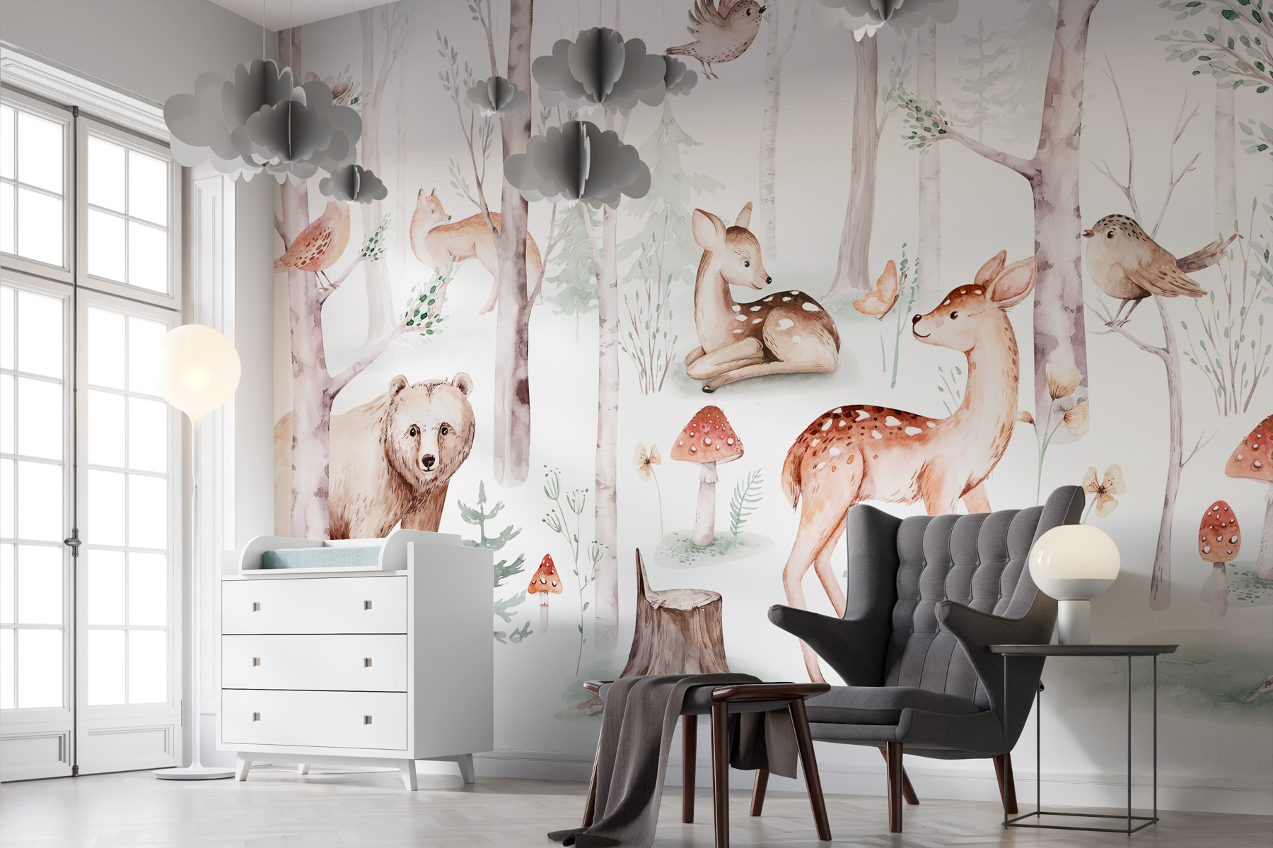 Merüljön el egy szeszélyes erdőben ezzel a bájos falfestménnyel. Képzelje el, hogy saját terében is van egy hangulatos erdei zug – barátságos szarvasokkal, kíváncsi rókákkal és halkan éneklő madarakkal. Olyan, mintha egy szelíd mesekönyvjelenetet látnál a faladon! Tökéletes a természet szerelmeseinek vagy bárkinek, akinek azonnali menekülésre van szüksége. Képzelje el, ahogy teát kortyolgatva, egy könyvvel a kezében, miközben ez a nyugodt környezet pihenésre hívja. Ki gondolta volna, hogy a faliképek ennyire… békések lehetnek? Alakítsa át szobáját egy nyugtató menedékké, ahol az erdő mindig virágzik.