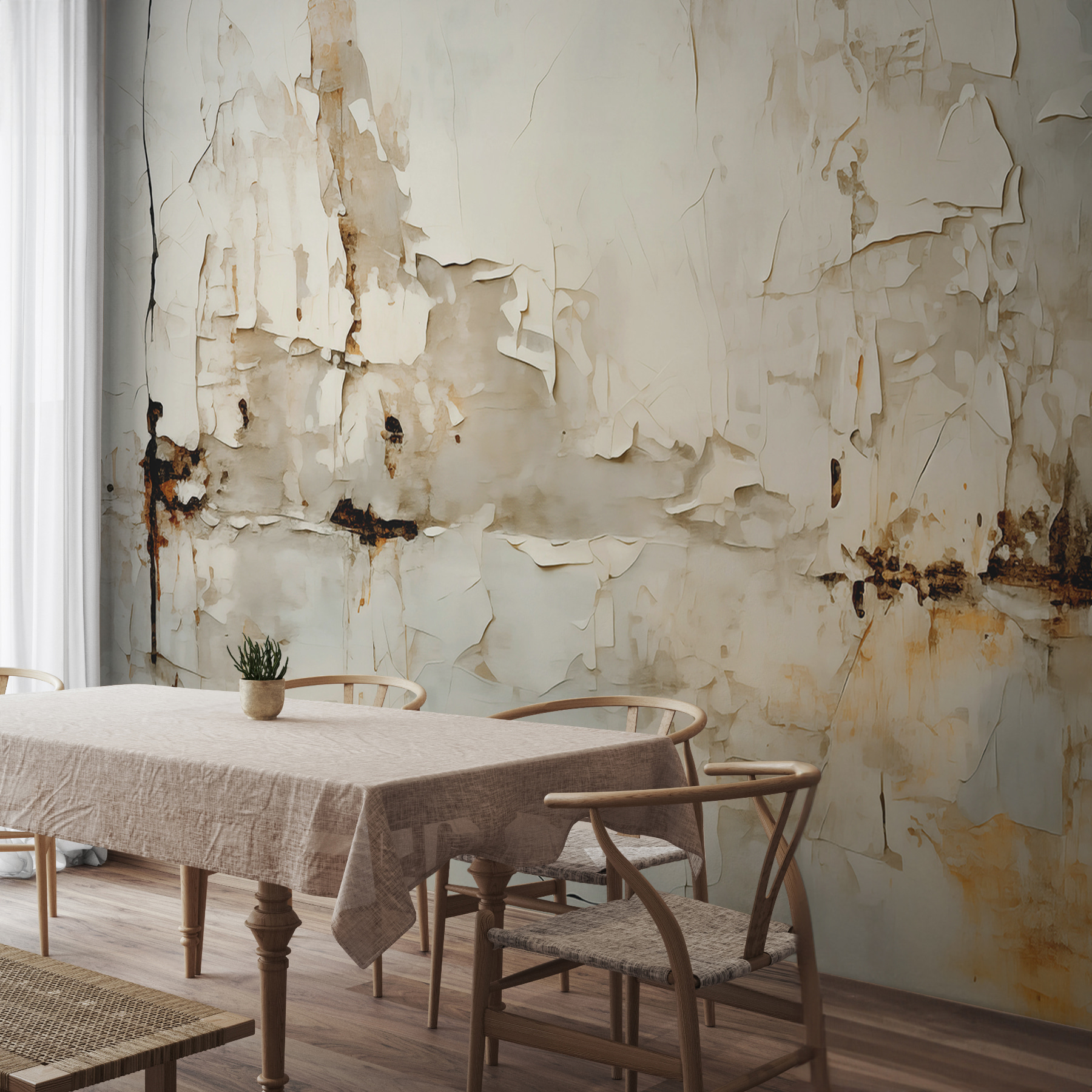 Képzelje el, hogy belép egy olyan szobába, ahol a falak az idő történeteiről suttognak – ez a falfestmény a lágy, hámló festékkel és a tompa árnyalatokkal pontosan ezt teszi. Olyan hangulatot áraszt, amely egyszerre művészi és kissé időjárásfüggő, és emlékek és megélt pillanatok hangulatát sugallja. Olyan, mintha egy régi, gyönyörű könyvet találnánk az újak tengerében. Tökéletes a hangulatos sarkokba vagy a váratlan akcentusfalra, hűvös hangulatot áraszt, és lusta délutánokra vagy mély beszélgetésekre hívja fel a figyelmet egy kávé mellett. Miért ne hagyná, hogy a tér meséljen egy történetet? Egy csipetnyi elegancia egy kis csavarral, ez a falfestmény könnyedén ötvözi a bájt egy csipetnyi nosztalgiával.