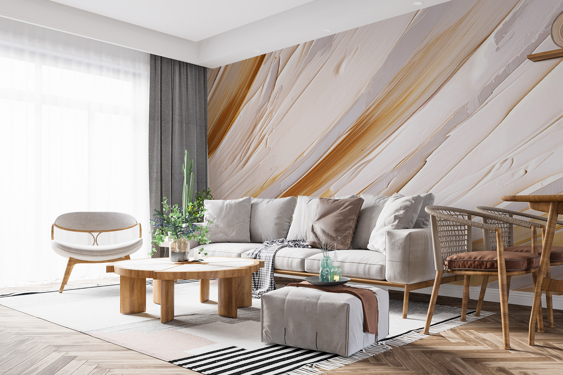 Alakítson át egy unalmas teret hangulatos elvonulási hellyé ezzel a bájos falfestménnyel, a “Művészi kifejezés krémes vonásai”-val. Képzelje el, hogy egy olyan szobába lép be, ahol a lágy árnyalatok úgy olvadnak össze, mint a tejszínhab, és lágyan kavarognak a meleg alaphangokkal. Ez nem csak falfestmény; olyan, mint egy ölelés az otthonodban. Ez a falfestmény nyugalmat és kreativitást hozhat, így tökéletes lehet egy olvasósarokba vagy egy kreatív sarokba. A barátok talán megkérdezik, ki a dekoratőröd, te pedig csak mosolyogsz, és azt mondod, hogy minden a művészetről szól (és talán egy kis szerencséről). Tökéletes azok számára, akik a szépséget felhajtás nélkül értékelik, ez a darab egyszerre egyszerű és kifinomult, így minden pillantás egy kis örömteli pillanat.