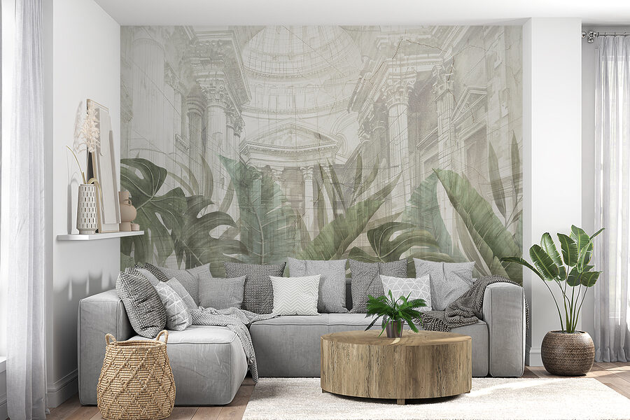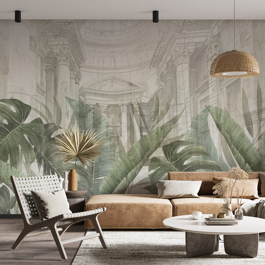 Alakítsa át terét álomszerű oázissá ezzel a falfestménnyel, amely egy buja, túlméretezett levelet ábrázol egy varázslatos háttér előtt. Képzelje el, hogy belép egy szobába, és azonnal felemelő érzéssel tölti el, mintha egy nyugodt kertbe lépett volna. A zöld növényzet és a lágy építészet finom összjátéka nyugodt hangulatot áraszt, amely tökéletes egy jó könyvvel való üldögéléshez vagy barátok fogadásához.