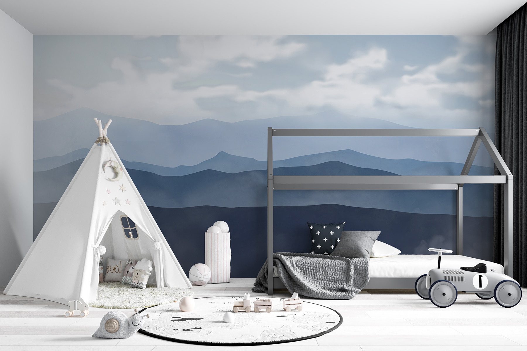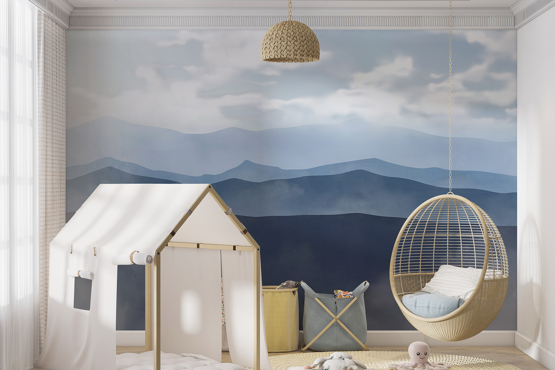 Alakítson át bármilyen helyiséget hangulatos elvonulási hellyé ezzel a lenyűgöző hegyvidéki falfestménnyel. Képzelje el, hogy a távoli hegycsúcsok lágy kék és szelíd szürke színeire ébred, miközben kedvenc foteljében, kávéval a kezében pihen. A felhők játékosan kavarognak felettünk, nyugalmat árasztva – szinte mintha a hegyek suttognák a nevét. Tökéletes választás nappaliba, hálószobába vagy abba a kis olvasósarokba, amelyről állandóan álmodozol. Legyen szó téli hidegről vagy nyári melegről, ez a falfestmény frissítő hangulatot áraszt, ami épp megfelelő érzés. Olyan, mint egy mini menekülés a természetbe, egyenesen az otthonodban!
