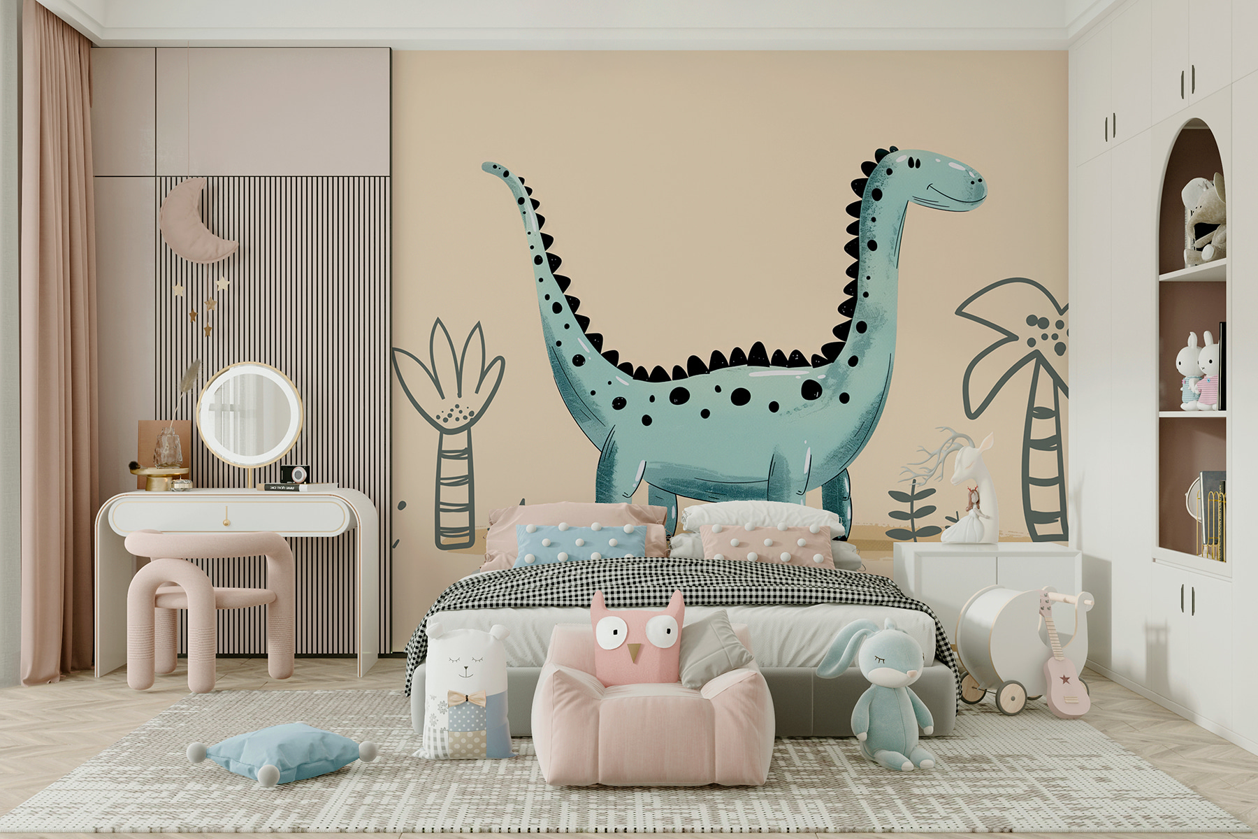 Képzeld el, hogy minden reggel erre a vidám teremtményre ébredsz… olyan, mintha egy vidám öleléssel indulna a napod! És azok az apró növények és pálmafák? Csak fokozzák az őskori dzsungel hangulatát – aranyos, nem igaz? Ez az a fajta falfestmény, amely egy unalmas falat egy elragadó mesebeli jelenetté varázsolhat.