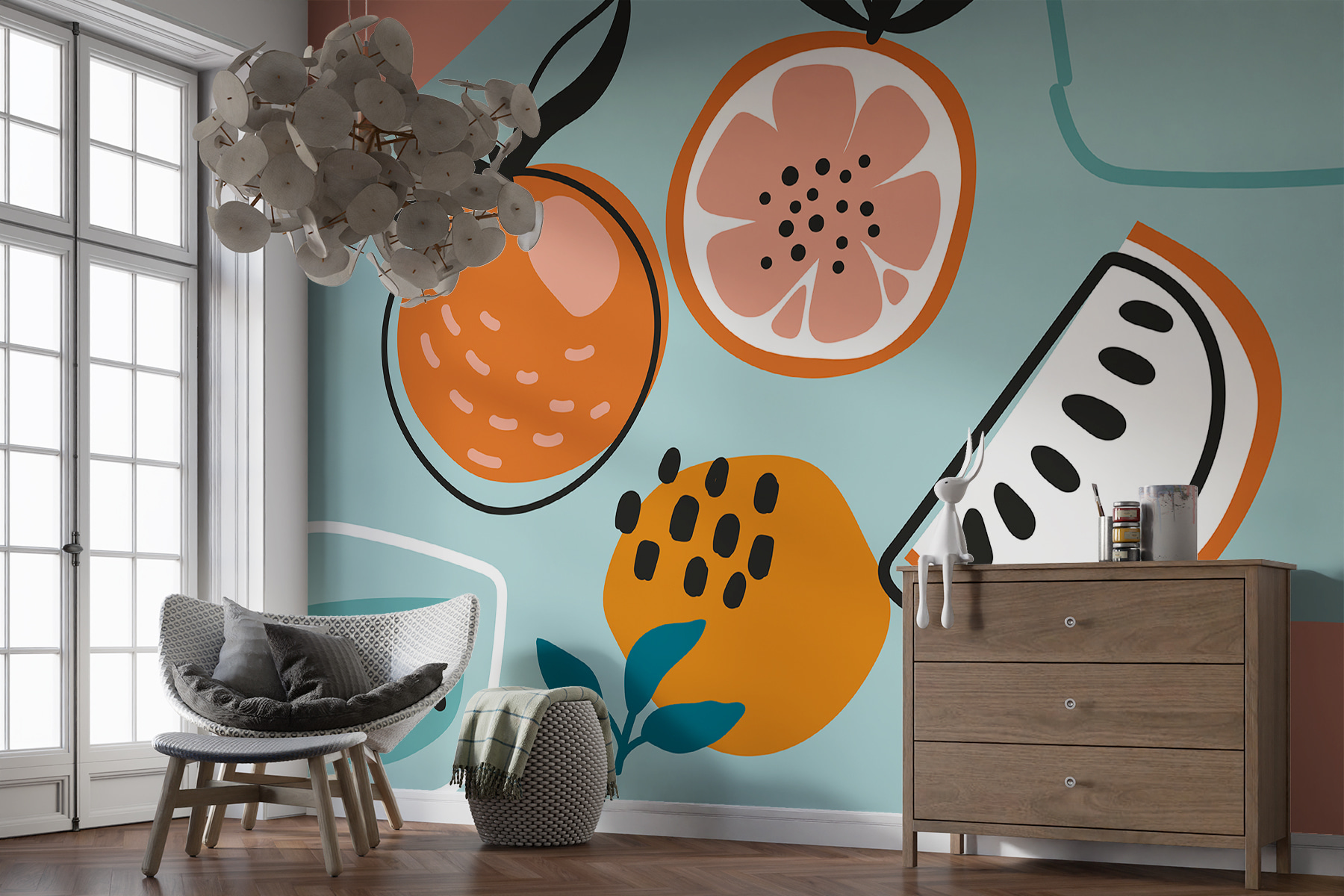 Szerette volna, ha a falak úgy mondanának valamit, hogy közben egy szót sem szólnak? Ismerje meg a W01421 falfestményeket! Ez a bájos falfestmény játékos pukkanást hoz bármilyen térbe, mint egy barátságos színfolt egy művész vázlatfüzetéből. A lédús narancsok szeleteivel, a furcsa formákkal és a természet vibrálásával olyan, mint egy spontán művészeti jam session, amely tökéletesen landolt a falán.