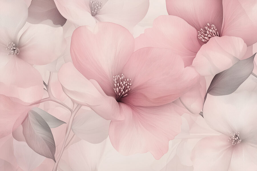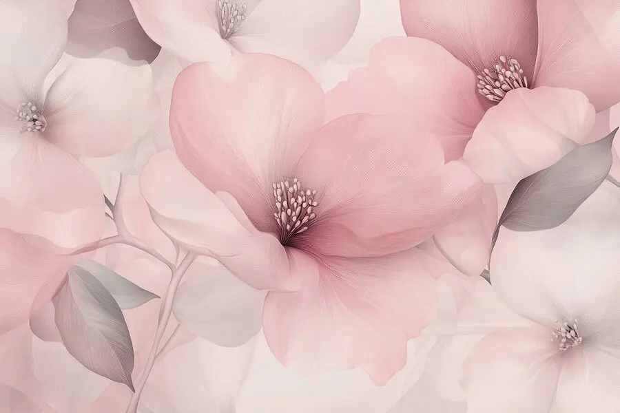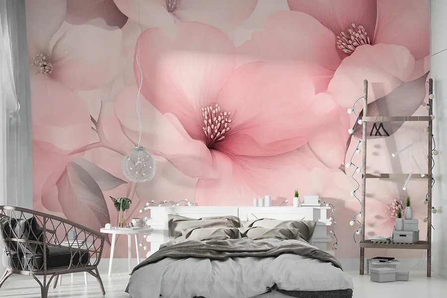 Képzeld el a következőt: felébredsz, álmos szemmel, és hirtelen, bumm – óriási, gyengéd virágok üdvözölnek, amelyek a faladon teszik a dolgukat. Nem tenné egy kicsit elviselhetőbbé a hétfő reggeleket? A rózsaszín és a nyugtató fehér árnyalatait vegyítve ez a falfestmény a nyugodt hangulatról szól – olyan, mintha egy nyugtató virágkiállítást hoznál a nappalidba.