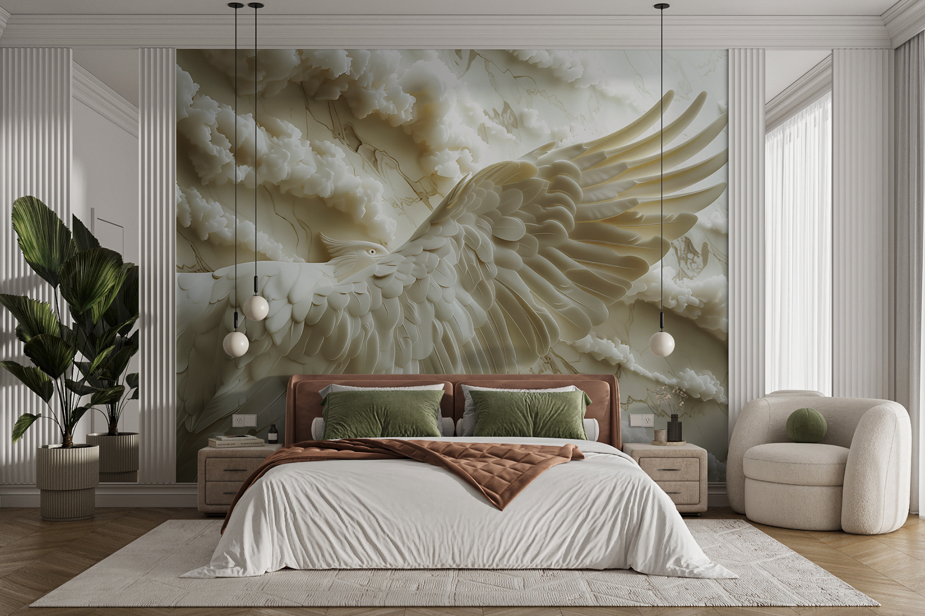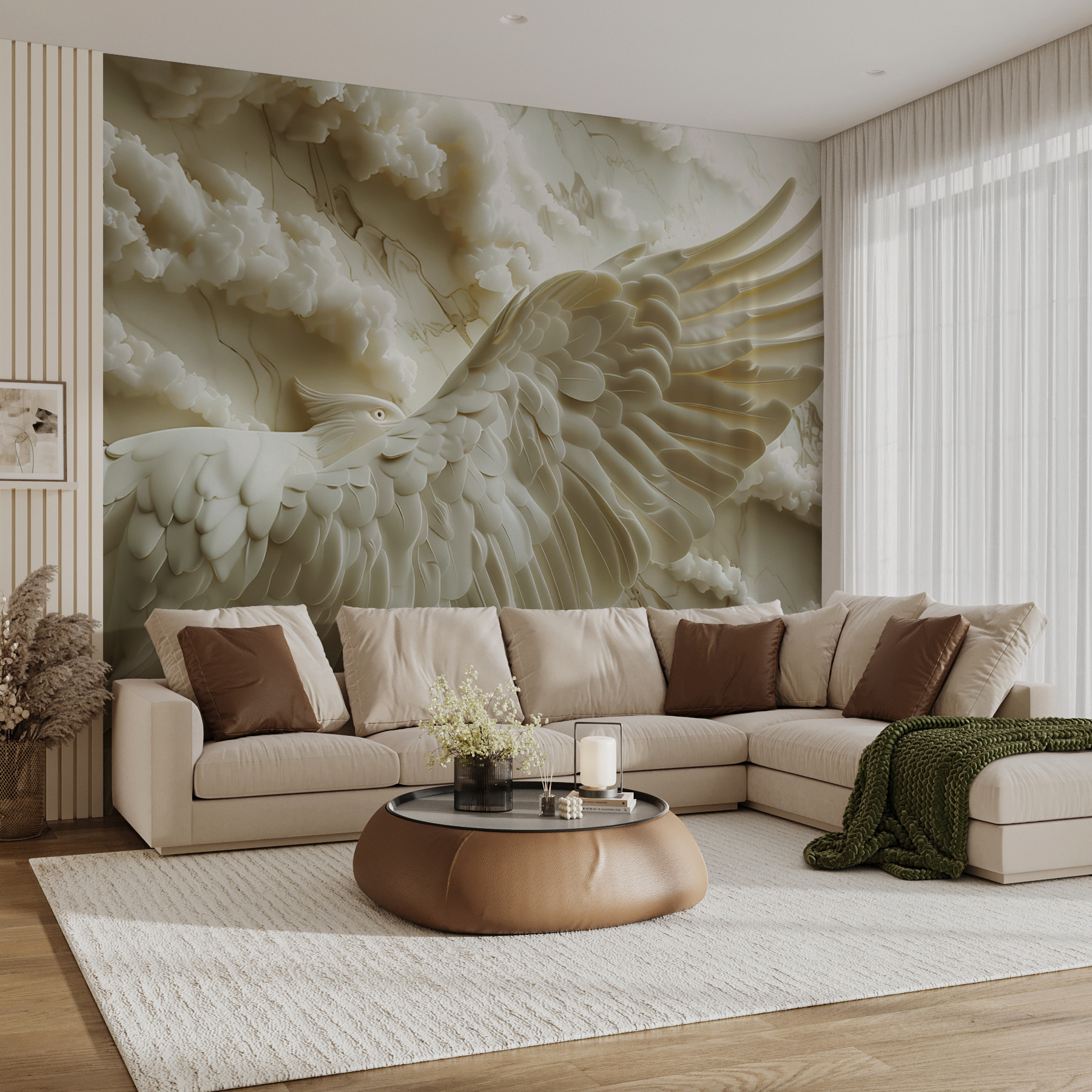 Bármely szobát alakítson át nyugodt meneküléssé a “Falfestmények Fehér madár kiterjesztett szárnyakkal” című faliképpel. Ez a lenyűgöző darab egy madár kecsességét örökíti meg repülés közben, lágy, áramló felhőkkel körülvéve. Képzelje csak el, hogy belép a helyiségébe, és azonnal nyugalmat érez, mintha a nyugodt égboltot nézné.