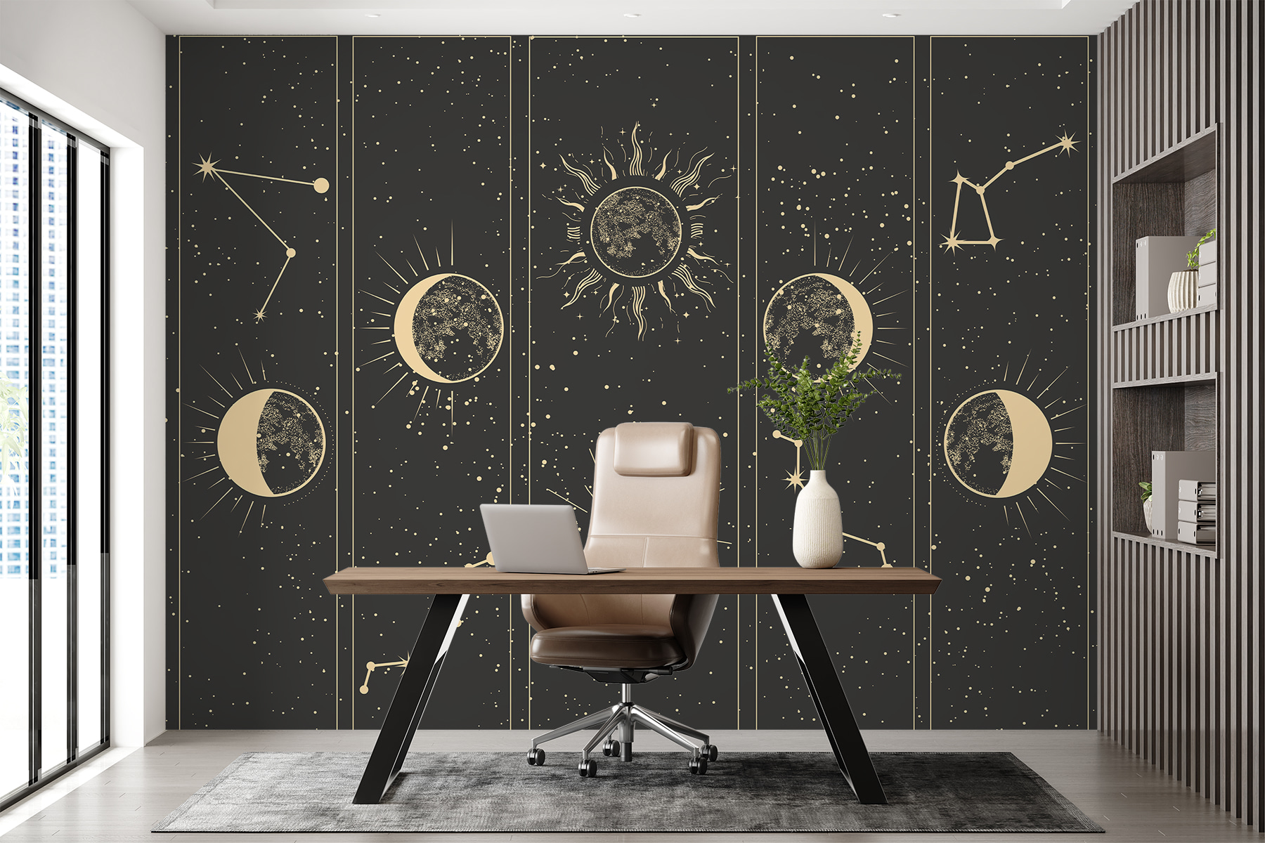 Képzelje el, hogy belép egy olyan szobába, ahol olyan érzés, mintha a kozmoszban lebegne! Ez a “Hold és csillagok” falfestmény álomszerű hangulatot kölcsönöz a helyiségnek, amely tökéletes a csillaglesők és a Hold szerelmesei számára egyaránt. Olyan, mintha az éjszakai égbolt egy darabja lenne az otthonodban – kivéve a hűvös szelet. A szeszélyes csillagképek táncot járnak a falon, megmozgatva a képzeletet. Akár a kanapén fekve merengsz az élet rejtélyein, akár csak egy kis kozmikus nyugalomra vágysz egy mozgalmas nap után, ez a falfestmény a jegyed a csillagok békéjéhez. Élvezze a varázslatot!