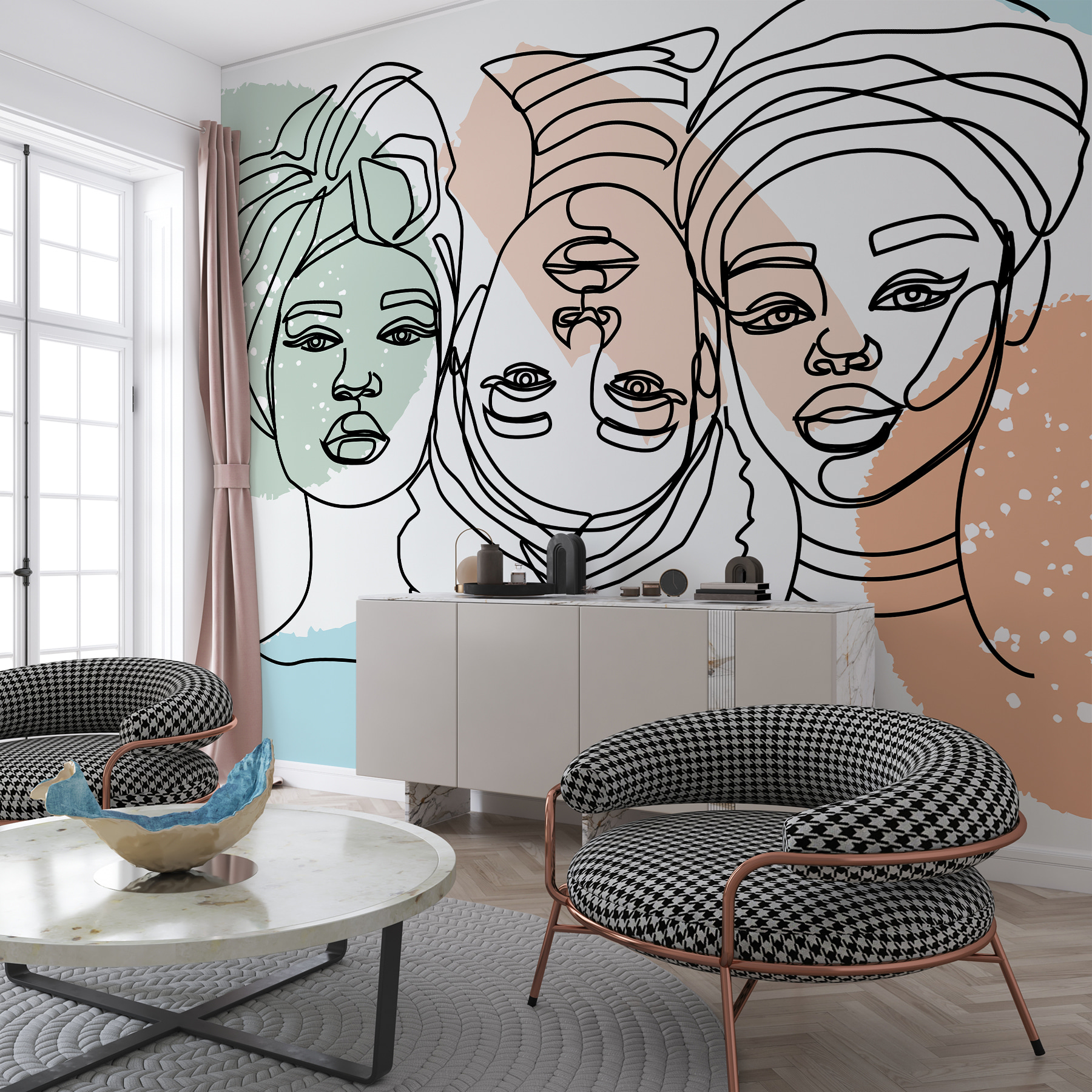 Ez a “Falfestmény női arcok csoportja” című alkotás olyan, mintha egy élénk beszélgetés lenne a falon. Képzeld el, hogy ezeknek az arcoknak a művészi tekintetére ébredsz – olyan, mintha titkokat osztanának meg egymással, vagy történeteket cserélnének. A lágy pasztellszínek nyugalmat árasztanak, míg az absztrakt vonalak érdekesen tartják a dolgokat. Akár a reggeli kávéját kortyolgatja, akár egy hosszú nap után lazít, ezek a falfestmények egy csipetnyi szeszélyt és szellemességet kölcsönöznek. Olyan, mintha minden alkalommal, amikor elsétálsz mellette, meleg ölelést kapnál a dekorációtól. Tökéletes mindazoknak, akik szeretik a falaikat olyan beszédesnek, mint a barátaikat!