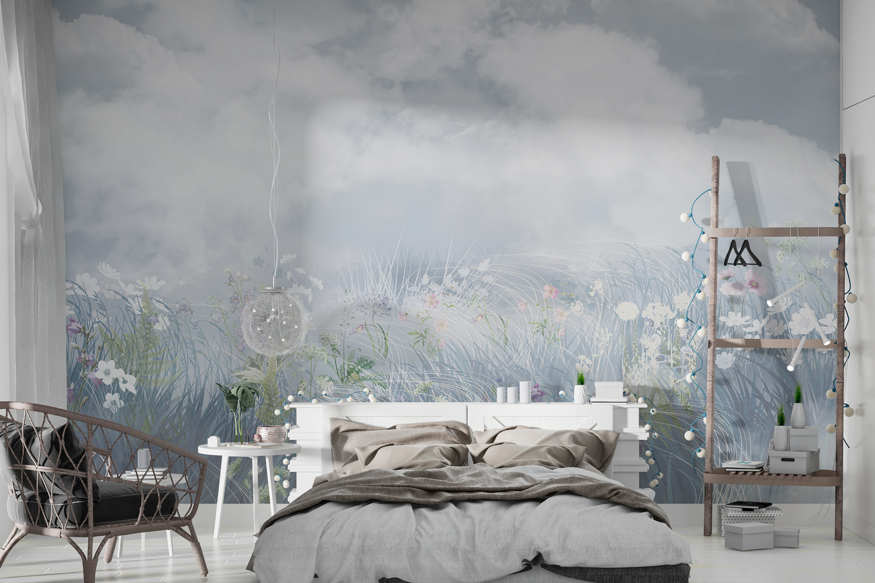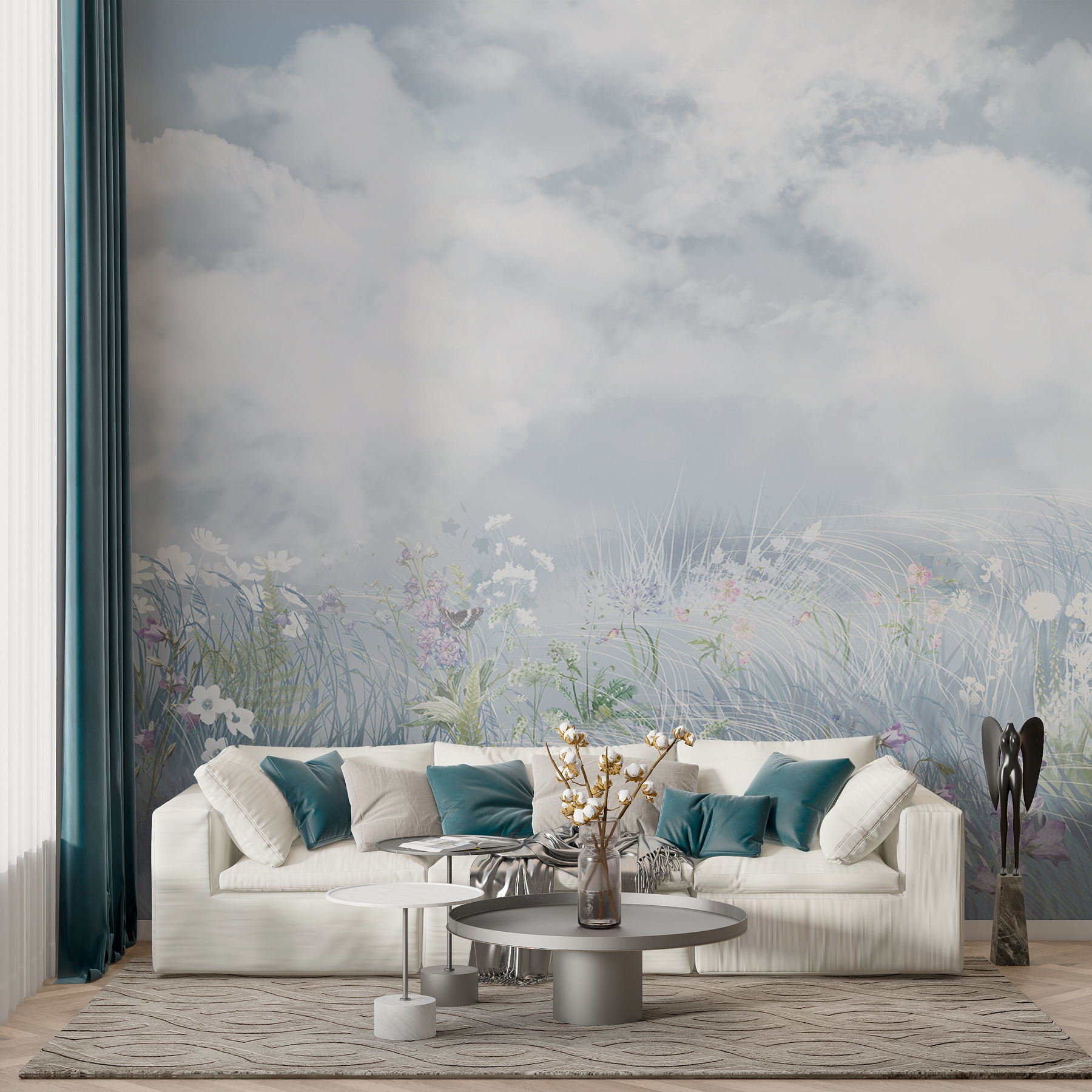 Képzelje el, hogy minden nap egy virágmezőre ébred – anélkül, hogy elhagyná kényelmes ágyát. Ez a falfestmény olyan pelyhes felhőket ábrázol, amelyek gyakorlatilag lesodródnak a falról, és olyan vadvirágokat, amelyek úgy tűnik, hogy a szemed előtt virágoznak. Olyan, mint egy akvarell álom a falon. Tökéletes azok számára, akik egy réten szeretnének szundikálni (a hangyák nélkül). Varázslatos módon kinyitja a szobát, nyugalmat és szellősséget áraszt. Tökéletes menekülés. Teával a kezedben talán elfelejted, hogy otthon vagy. Boldogító, nem igaz?