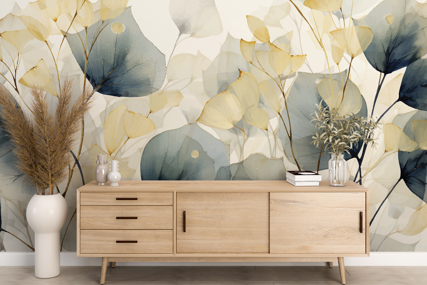 Alakítson át bármilyen helyiséget a varázslatos “A természet árnyalatainak elegáns tánca” freskóval, ahol a lágy lombok találkoznak egy akvarell álommal. Ez a gyönyörű dizájn üdítően hat, így egész évben tavaszias érzést kölcsönöz. Képzelje el, ahogy teát szürcsölget, körülvéve kecses kék és lágy aranyszínű levelekkel. Ez nem csak dekoráció; hangulatot teremt. Legyen szó egy hangulatos olvasósarokról vagy egy élénk nappaliról, ez a falfestmény nyugalomra és kreativitásra egyaránt invitál. Hagyja, hogy a természet beáradjon a helyiségébe, és figyelje, ahogyan örömöt, inspirációt és talán egy kis álmodozást is kivált.