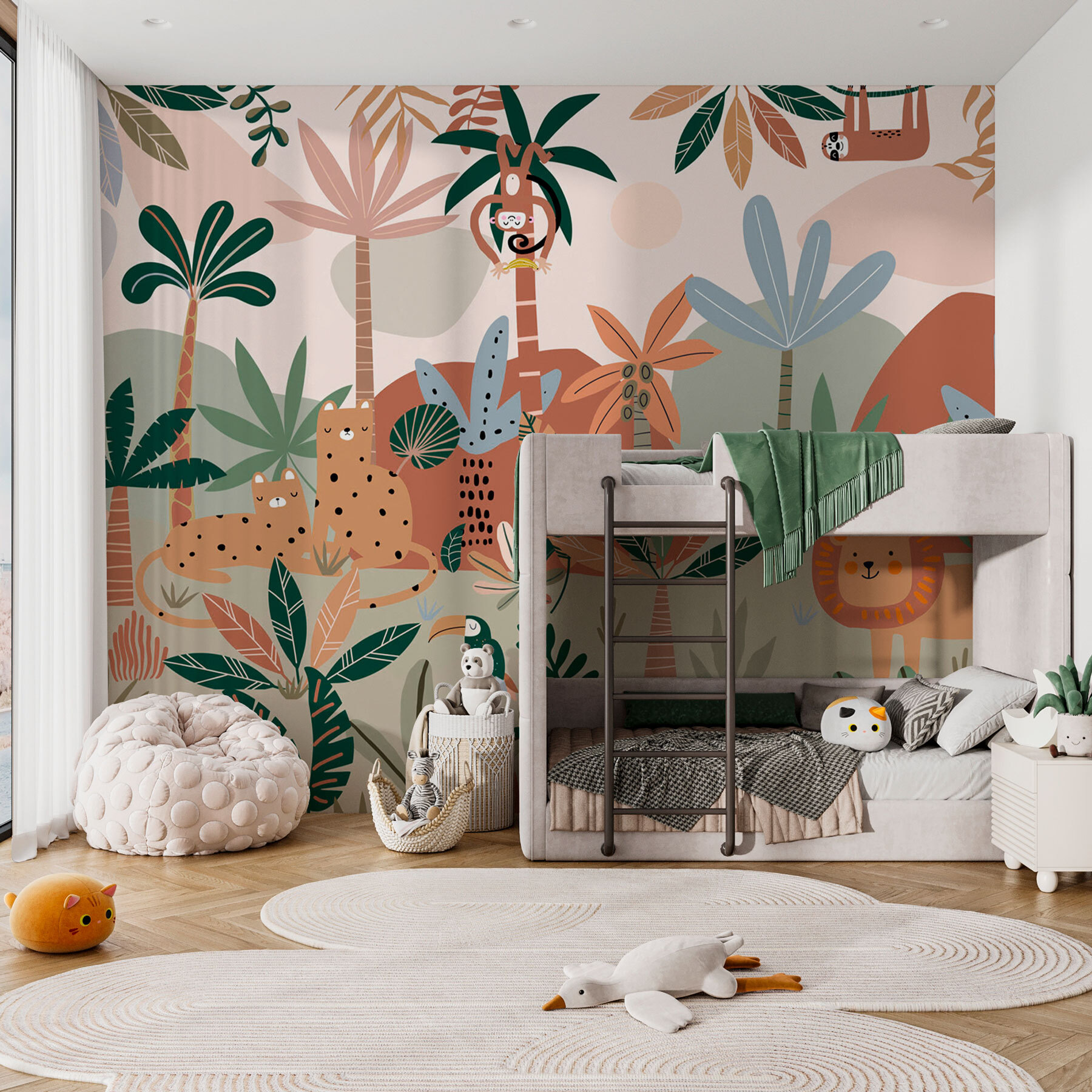 Lépj be a dzsungelbe anélkül, hogy elhagynád a házadat! Ez a játékos falfestmény olyan, mintha egy mini szafari kalandot élnél át a saját nappalidban. Képzelje el a vidám oroszlánokat, imádnivaló lajhárokat és pimasz majmokat, amelyek átkukucskálnak az élénk zöldek és földszínek sűrű lombkoronáján. Olyan vidám, furcsa hangulata van, amely mosolyt csal az arcodra, mintha megtaláltad volna rég elveszett kedvenc pulóveredet. Ideális gyerekszobákba, vagy legyünk őszinték, bárkihez, aki szereti a szeszélyeket. Ez egy csöppnyi vadság, hogy feldobja a mindennapokat.
