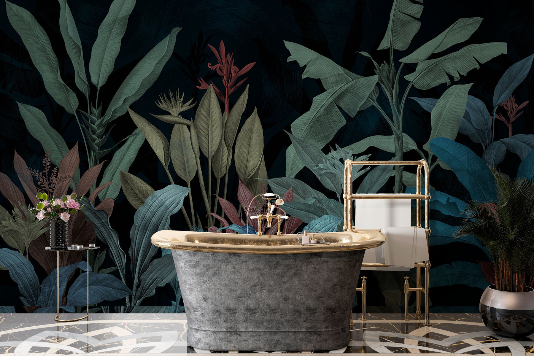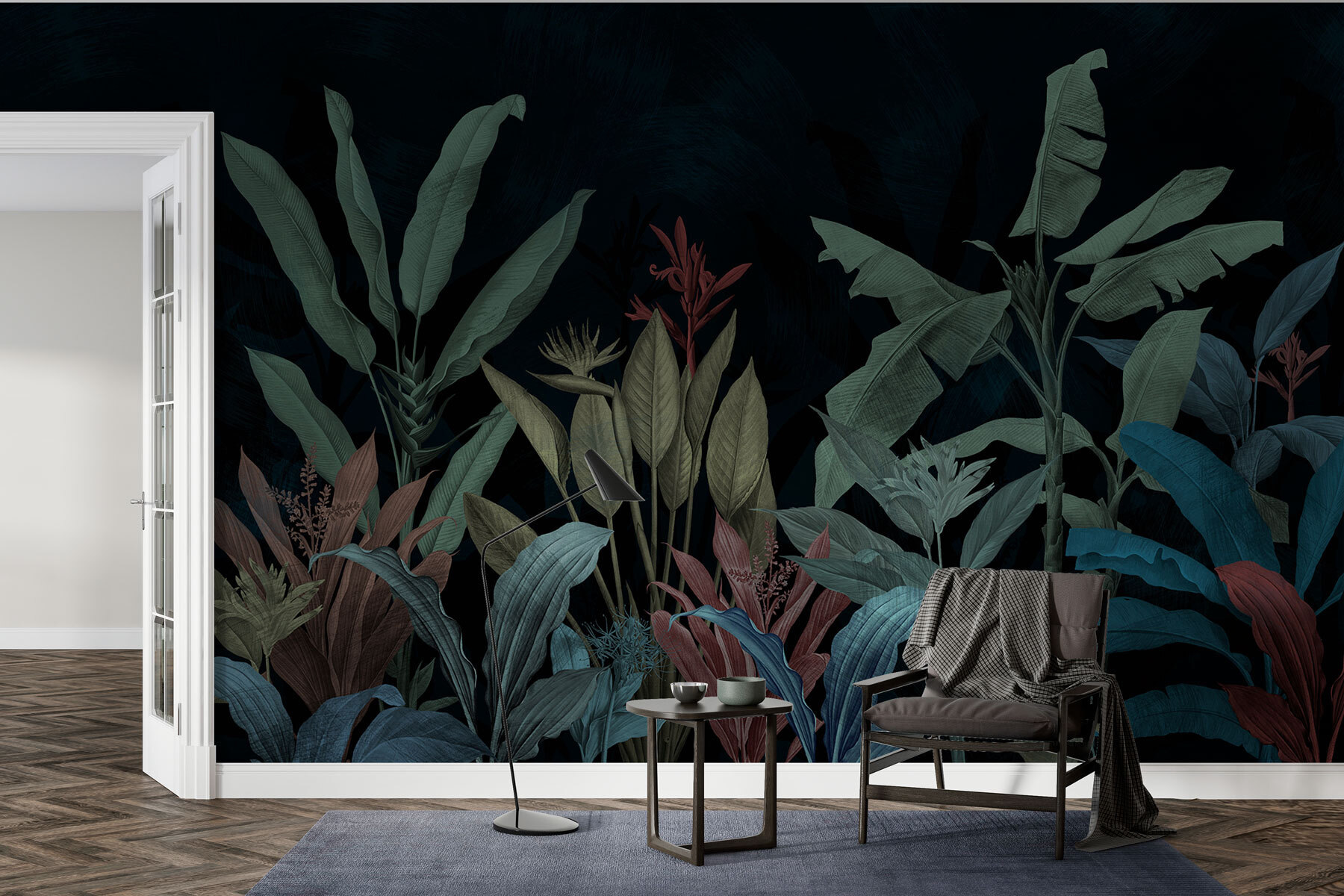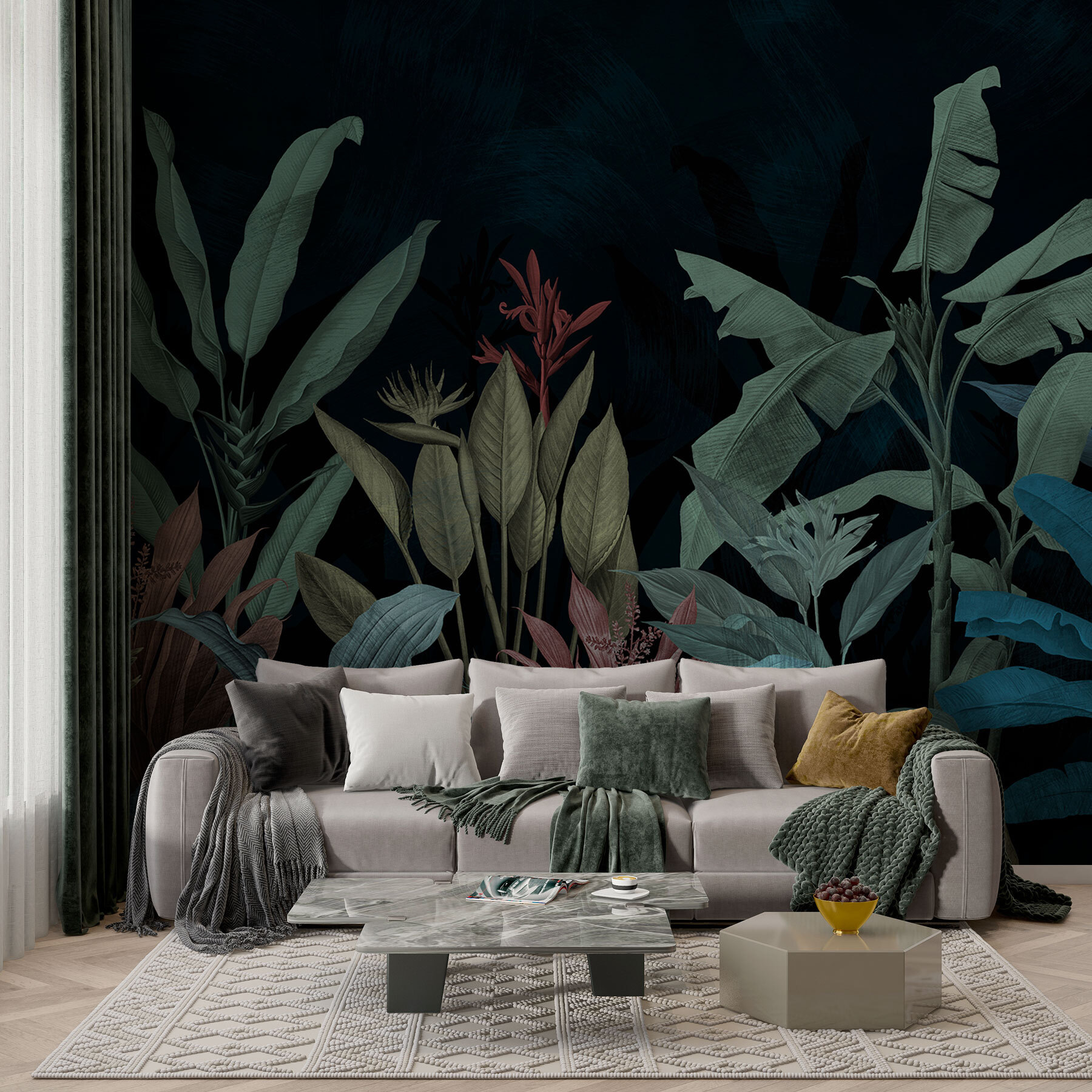 Képzelje el, hogy belép egy szobába, és úgy érzi, mintha egy varázslatos éjszakai dzsungelbe lépett volna. Ezt kínálja az “Éjszakai szerenád zöldben és kékben”. Ez a falfestmény nem csak egy falburkolat – ez egy hangulat. A gazdag zöldek és kékek úgy játszanak együtt, mint egy halk éjszakai szimfónia, amely tökéletes hely a kikapcsolódásra. Képzeld el: hosszú napod volt, és csak pihenni szeretnél. Ezek a buja levelek a karjaikba zárnak, és távoli trópusokról suttognak meséket. Olyan, mint egy távoli kaland, csak az időeltolódás nélkül.