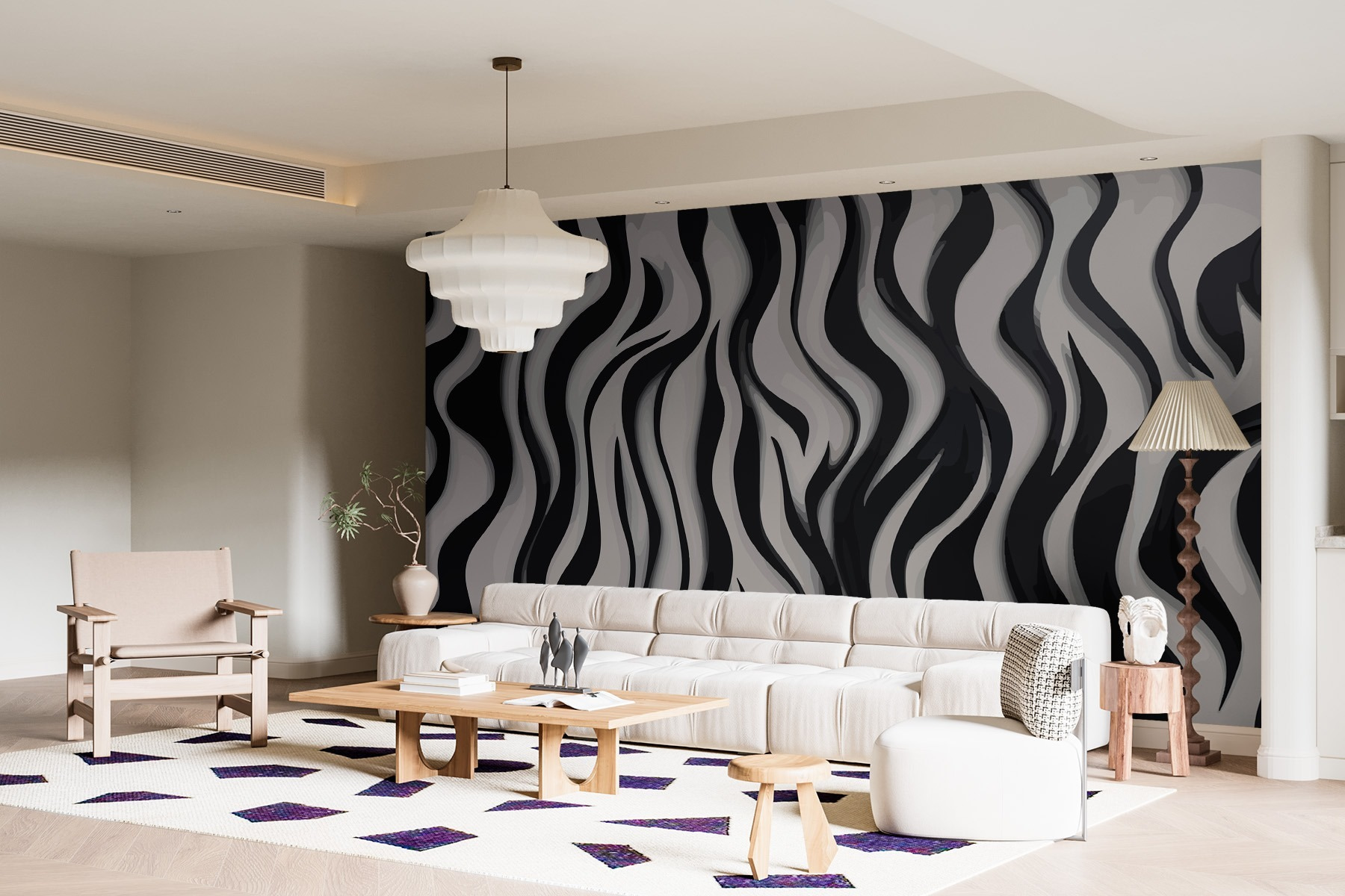 Járt már úgy, hogy belépett egy szobába, és azonnal hűvösebbnek érezte magát? Ismerd meg a “Fekete-fehér csíkos mintás” falfestményt – egy olyan dizájnt, amely olyan, mintha táncolna a falon. A falfestmény merész, hullámos csíkjai tökéletesen feldobják az unalmas tereket, és a klasszikus fekete-fehér színt pikánsan feldobják. Képzelje el, hogy egy csésze tea mellett hátradőlve úgy érzi, mintha egy elegáns művészeti galériában lenne. Ettől még a macskád is kifinomultnak érezheti magát. Igazi beszélgetésindító, ideális mindazoknak, akik szeretik a drámaiságot dráma nélkül.