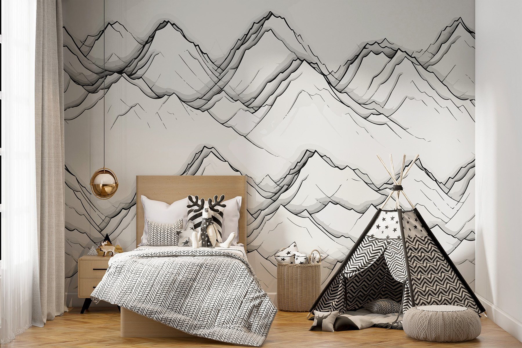 Képzelje el, hogy hazatérve a tér olyan, mint egy nyugodt üdülőhely! Ez a “Hegyek rajza” falfestmény olyan, mintha egy nyugodt alpesi jelenetbe lépne anélkül, hogy elhagyná otthonát. Tökéletes a nyughatatlan utazónak vagy álmodozónak. A szelíd tónusok a béke érzetét keltik – nem szükséges túrabakancs. Beszélgetésindító, biztosan megállásra és csodálatra készteti a vendégeket. Képzelje el, ahogyan kávét kortyolgat, miközben tekintete végigvándorol az egyes csúcsokon. Ez nem csak dekoráció; ez egy mindennapi menekülés, ott a falon.