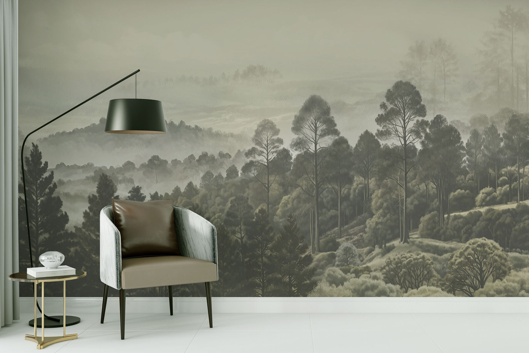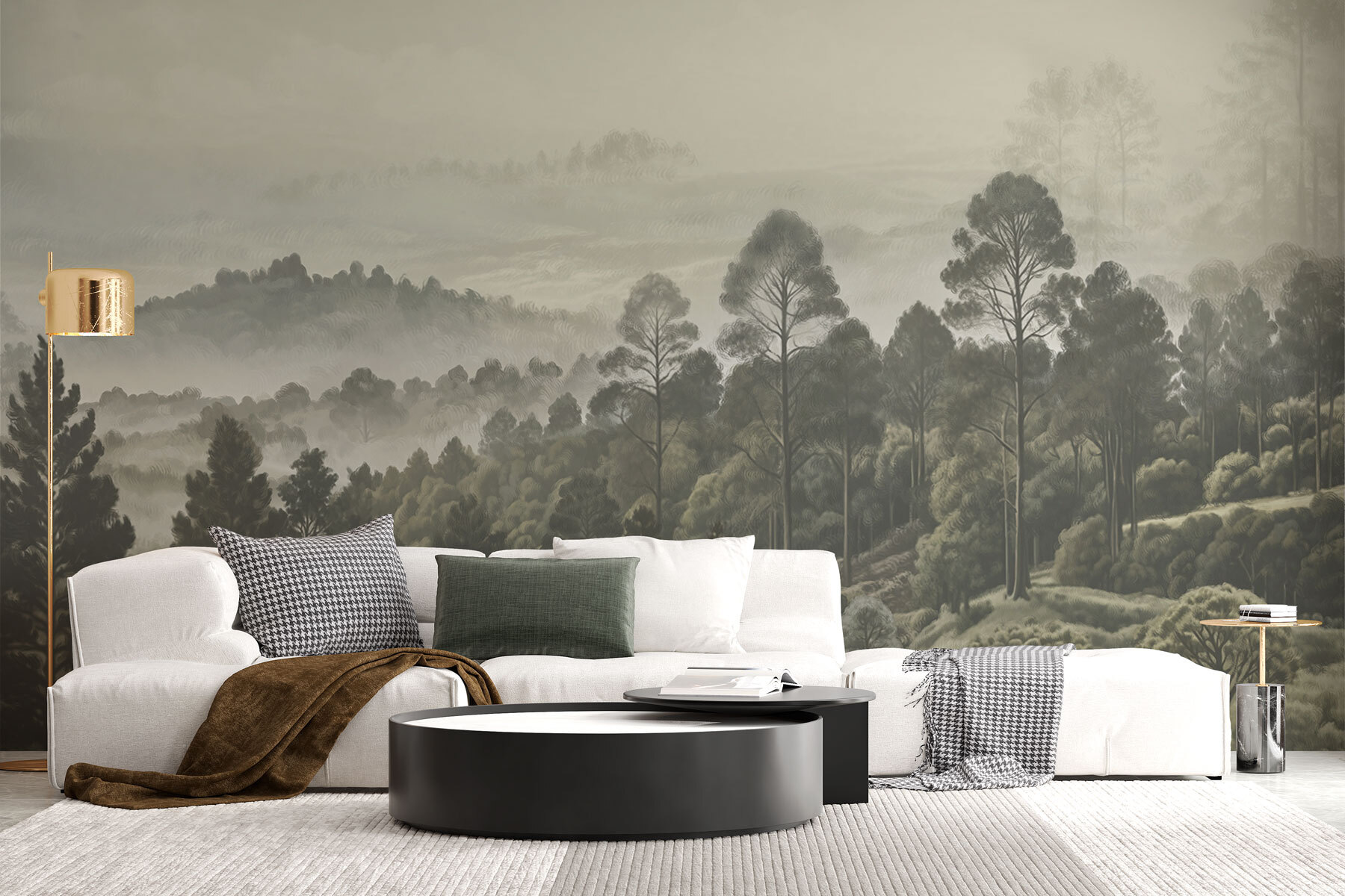 Képzelje el, hogy a nappalijában kávézik, de ahelyett, hogy egy sima falat bámulna, egy álomszép, fákat és ködöt ábrázoló falfestményt lát. Olyan, mintha egy hangulatos, ködös reggeli erdei sétát tennél – persze a bogarak nélkül. A tompa zöldek és a lágy szürkék olyanok, mintha gyengéden ölelnének, tökéletes relaxációs zónát teremtve. Talán még azt is elfelejted, hogy bent vagy. Ez nem csak egy falfestmény; ez egy hangulat. Egy finom menekülés anélkül, hogy elhagynád az otthonodat. Csak ne lepődjön meg, ha vendégei kicsit tovább időznek!