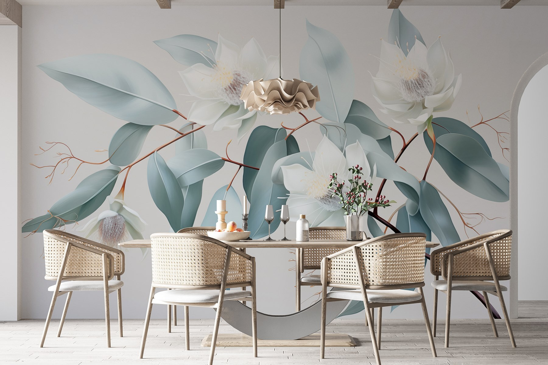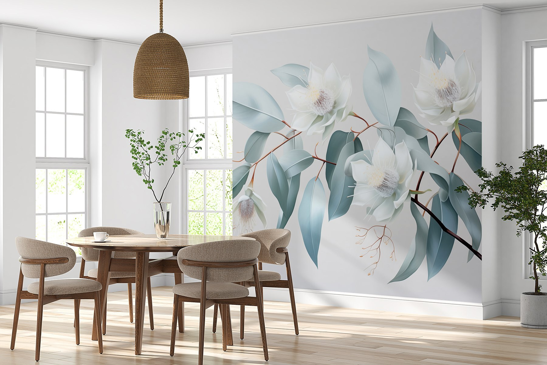 Alakítsa át terét egy nyugodt meneküléssé ezzel a lenyűgöző falfestménnyel, a “Fehér virágok és levelek egy ágon” cíművel. Képzeld el, hogy minden reggel ezekre a finom virágokra ébredsz, és hagyod, hogy nyugodt szépségük lágy szellőként árasszon el téged. A lágy színek és a bonyolult részletek nyugtató hátteret teremtenek, amely tökéletes egy hangulatos olvasósarokba vagy egy elegáns étkezőbe. Olyan, mintha egy kis természetet hozna be a házba, de a bosszantó pollenek nélkül! A barátok megjegyzik majd, milyen üdítő érzés a tér, és minden növénykedvelő haverja irigyelni fogja. Komolyan, ki gondolta volna, hogy a dekoráció ilyen egyszerű és élvezetes lehet? Csak egy pillantás, és nehéz nem mosolyogni.