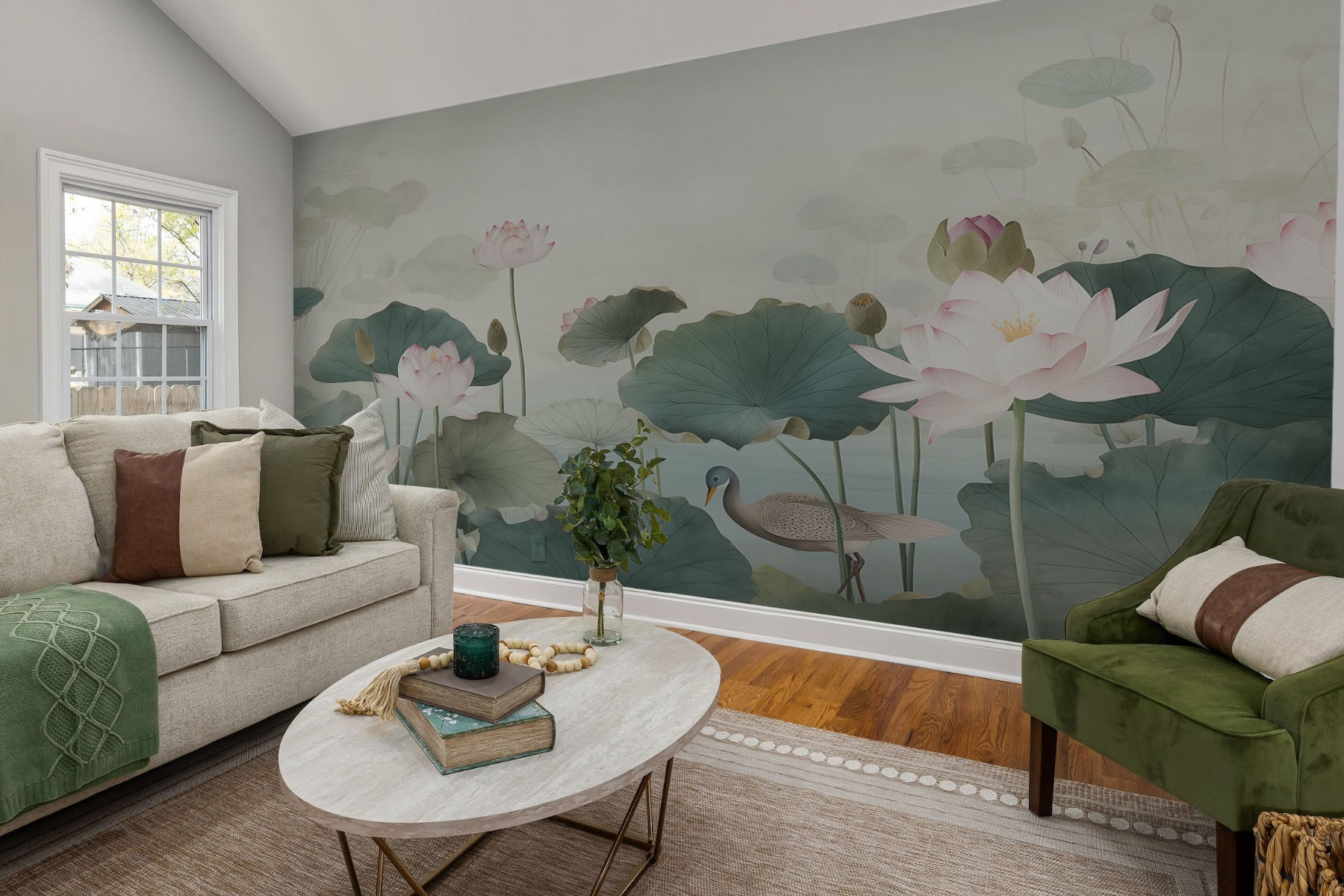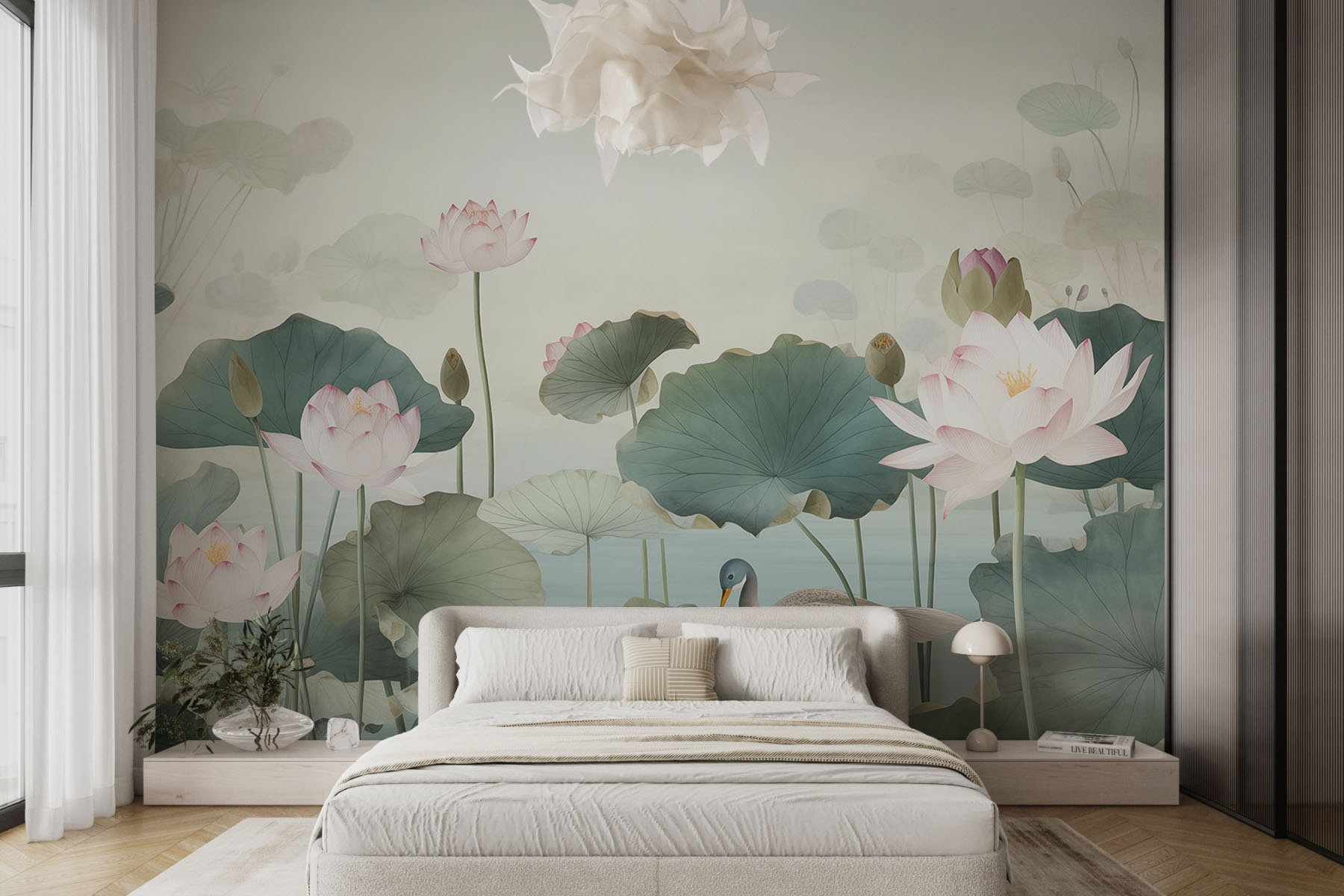 Bármilyen teret nyugodt oázissá varázsolhatsz ezzel a varázslatos falfestménnyel, amelyen egy kacsa kecsesen evickél egy gyönyörű lótuszvirágokkal díszített nyugodt tóban. A lágy akvarell hatás álomszerű hangulatot kölcsönöz, amely tökéletes egy hangulatos olvasósarokba vagy egy békés hálószobai visszavonuláshoz. Képzelje el, ahogy a nyugtató színekbe burkolózik, miközben teát kortyolgat, vagy távoli helyekről álmodozik. Olyan, mintha a természet suttogását hozná be a házba, a bosszantó bogarak nélkül! Ez a falfestmény nem csak dekoráció; ez a nyugalom egy kis darabja, amely minden alkalommal, amikor arra jár, halk sóhajt idéz elő.