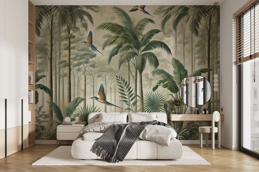 Alakítson át bármelyik szobát nyugodt meneküléssé ezzel a lenyűgöző freskóval, amelyen madarak szárnyalnak egy buja erdő felett. Képzelje el, hogy belépve egy nyugodt dzsungelben érzi magát, ahol élénk színek pompáznak, és a levegő a trópusi lombok illatával van tele. A madarak játékos repülése egy csipetnyi szeszélyt kölcsönöz, feldobva még a legunalmasabb tereket is. Ez a falfestmény tökéletesen alkalmas egy hangulatos olvasósarok vagy egy békés visszavonulási hely kialakításához, és lágyan suttogja a kalandot és a nyugalmat. Ideális mindenkinek, aki szereti a természetet, vagy csak egy kis menekülésre vágyik a mindennapi nyüzsgés elől – mert ki ne szeretné úgy érezni magát, mintha egy trópusi kiránduláson lenne? Hagyd hát, hogy a falak énekeljenek és feldobják a teret!