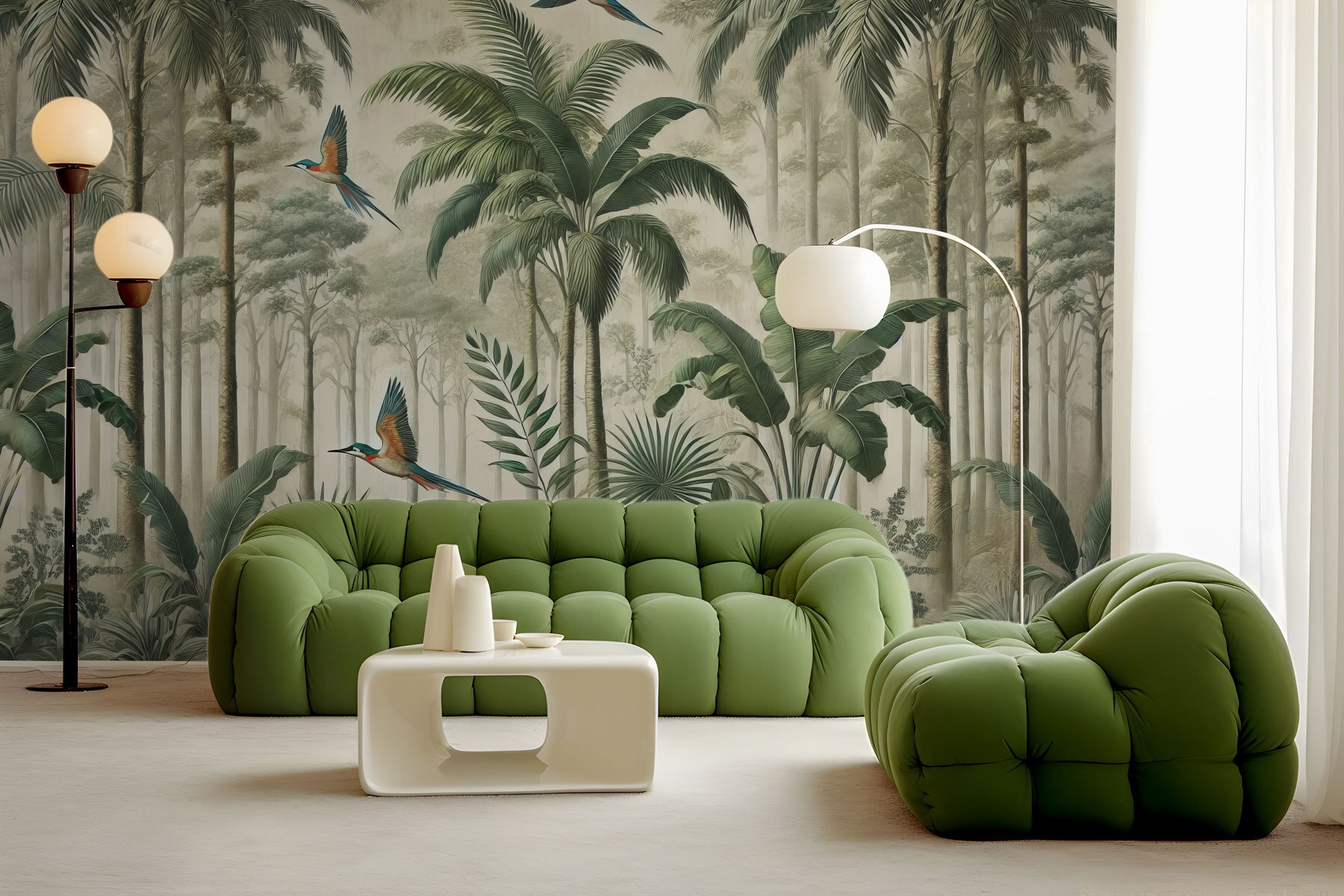 Alakítson át bármelyik szobát nyugodt meneküléssé ezzel a lenyűgöző freskóval, amelyen madarak szárnyalnak egy buja erdő felett. Képzelje el, hogy belépve egy nyugodt dzsungelben érzi magát, ahol élénk színek pompáznak, és a levegő a trópusi lombok illatával van tele. A madarak játékos repülése egy csipetnyi szeszélyt kölcsönöz, feldobva még a legunalmasabb tereket is. Ez a falfestmény tökéletesen alkalmas egy hangulatos olvasósarok vagy egy békés visszavonulási hely kialakításához, és lágyan suttogja a kalandot és a nyugalmat. Ideális mindenkinek, aki szereti a természetet, vagy csak egy kis menekülésre vágyik a mindennapi nyüzsgés elől – mert ki ne szeretné úgy érezni magát, mintha egy trópusi kiránduláson lenne? Hagyd hát, hogy a falak énekeljenek és feldobják a teret!