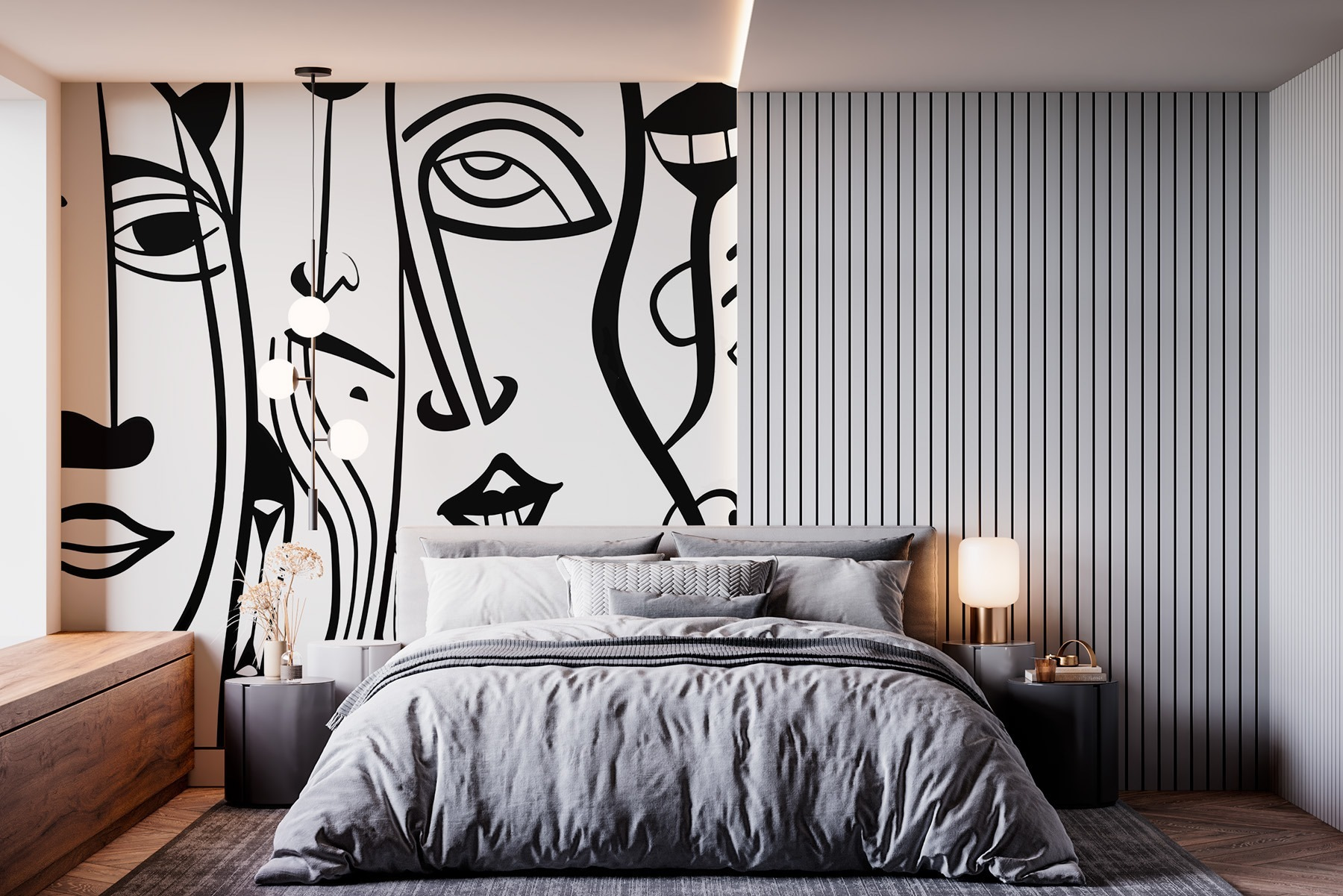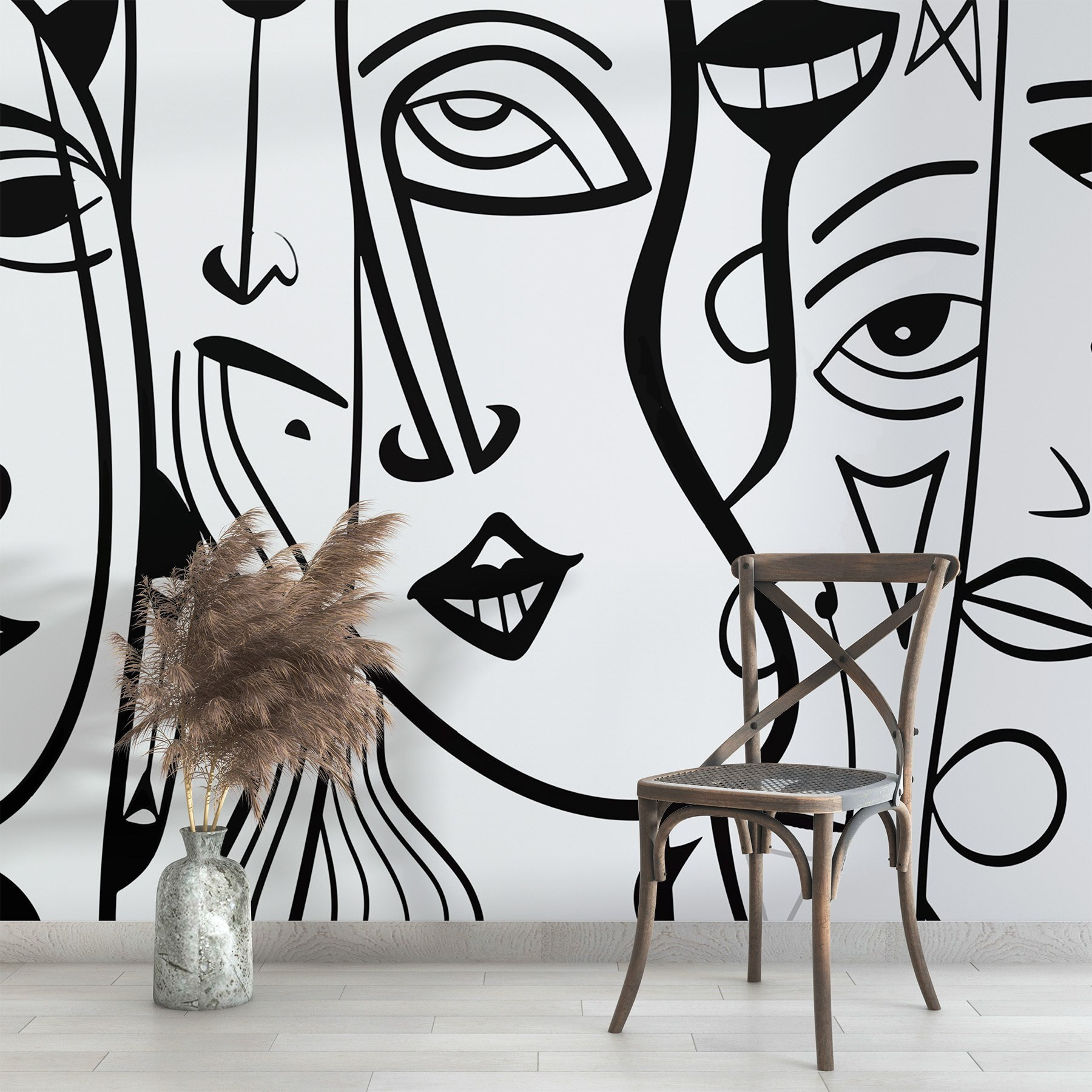 Alakítsa át terét ezzel a lenyűgöző fekete-fehér falfestménnyel, amelyen kifejező arcok keveréke látható. Olyan, mintha egy művészeti galéria lenne közvetlenül a nappalidban, de az igényes hangulat nélkül. A merész vonalak és a játékos formák beszélgetésre invitálnak – képzelje csak el, ahogy a barátok megállnak a mondat közepén, hogy megcsodálják, miközben megpróbálják megfejteni a furcsa arckifejezésekbe fagyott érzelmeket.